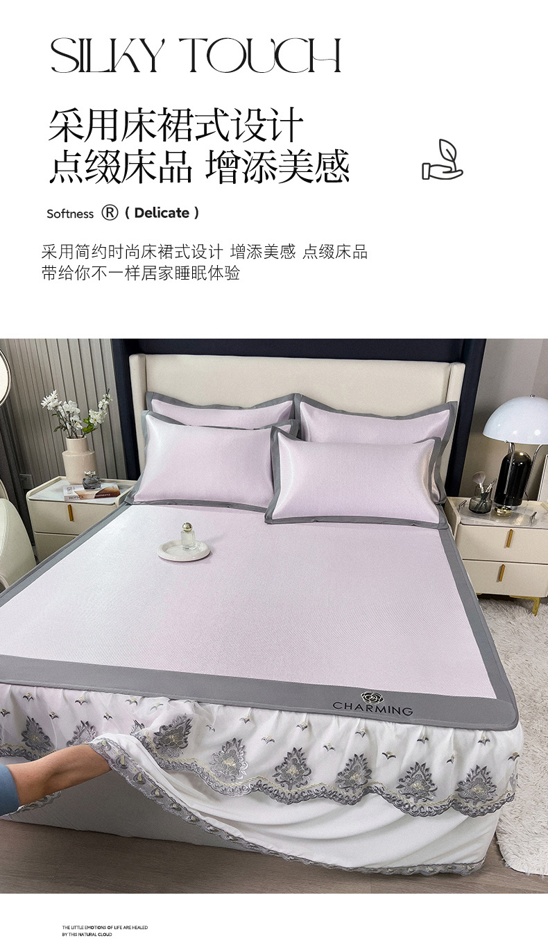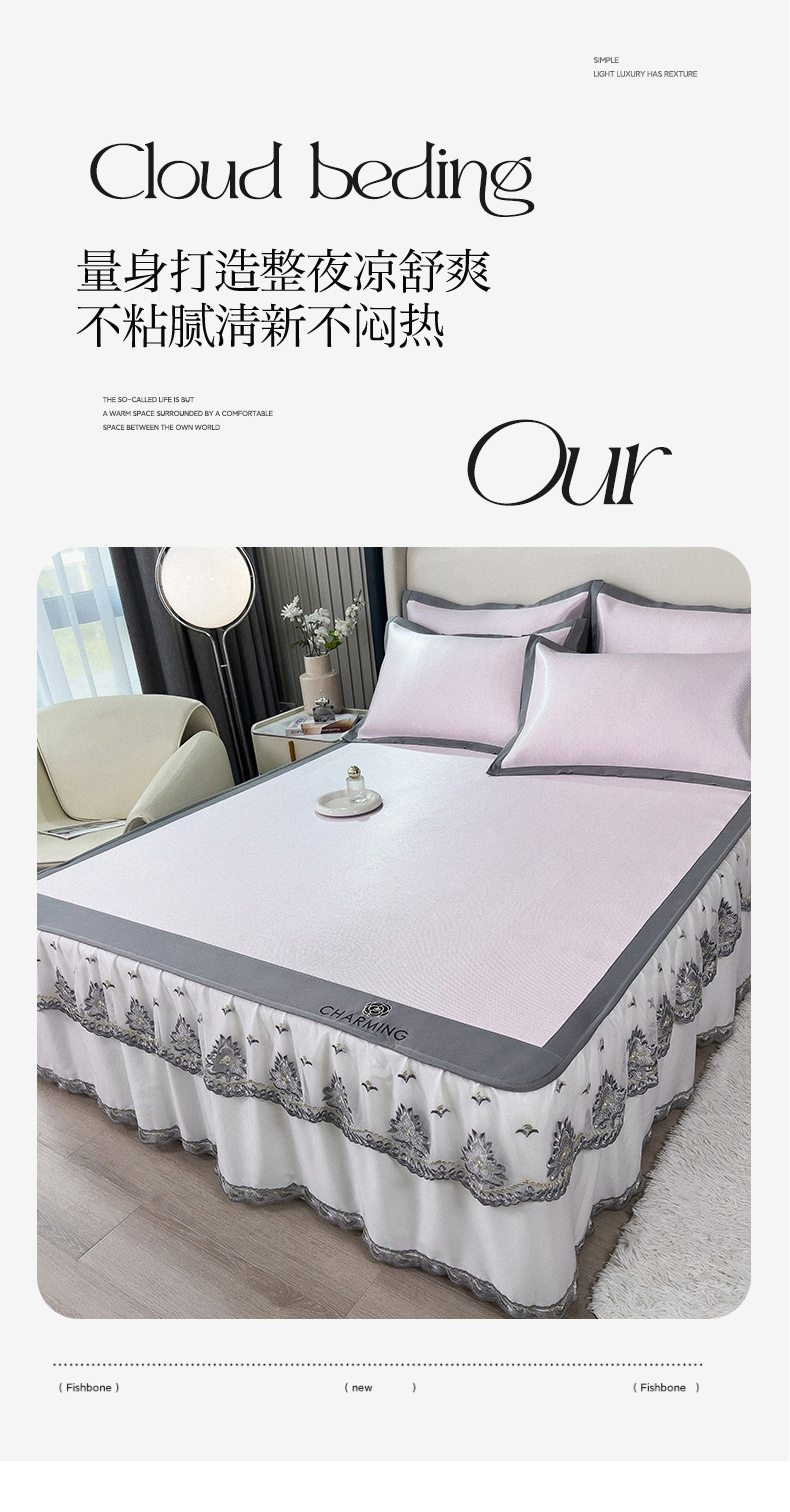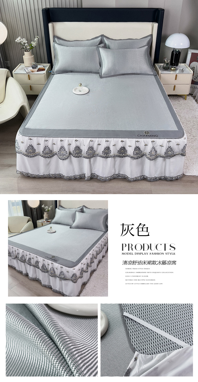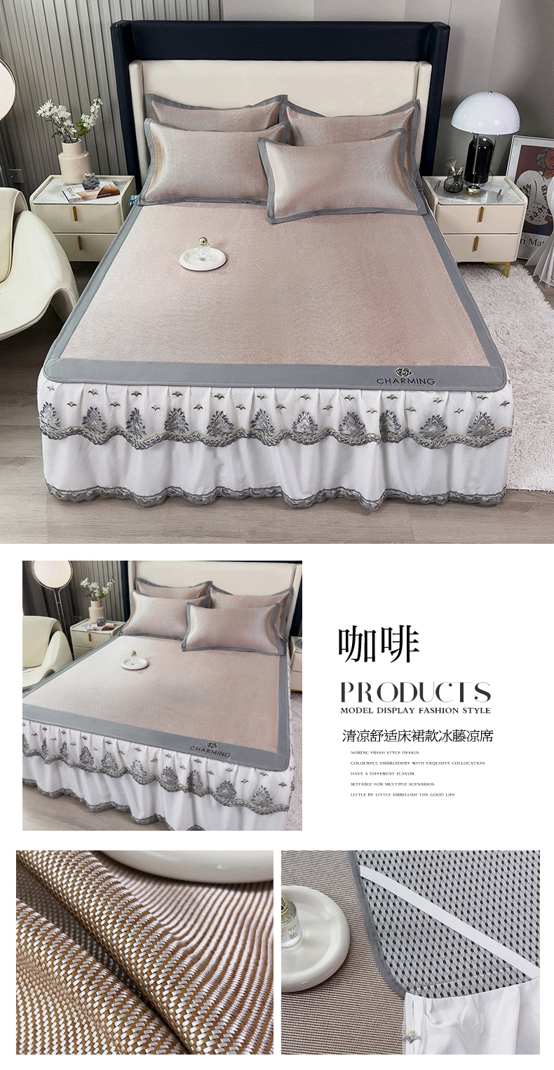 (总)印季家纺 2025新款纯色加密冰藤床裙凉席,粉色,灰色,咖啡,浅紫,水绿,天蓝