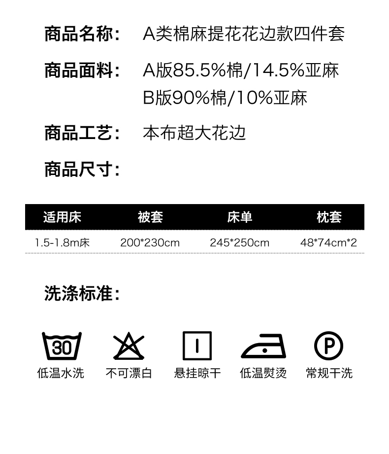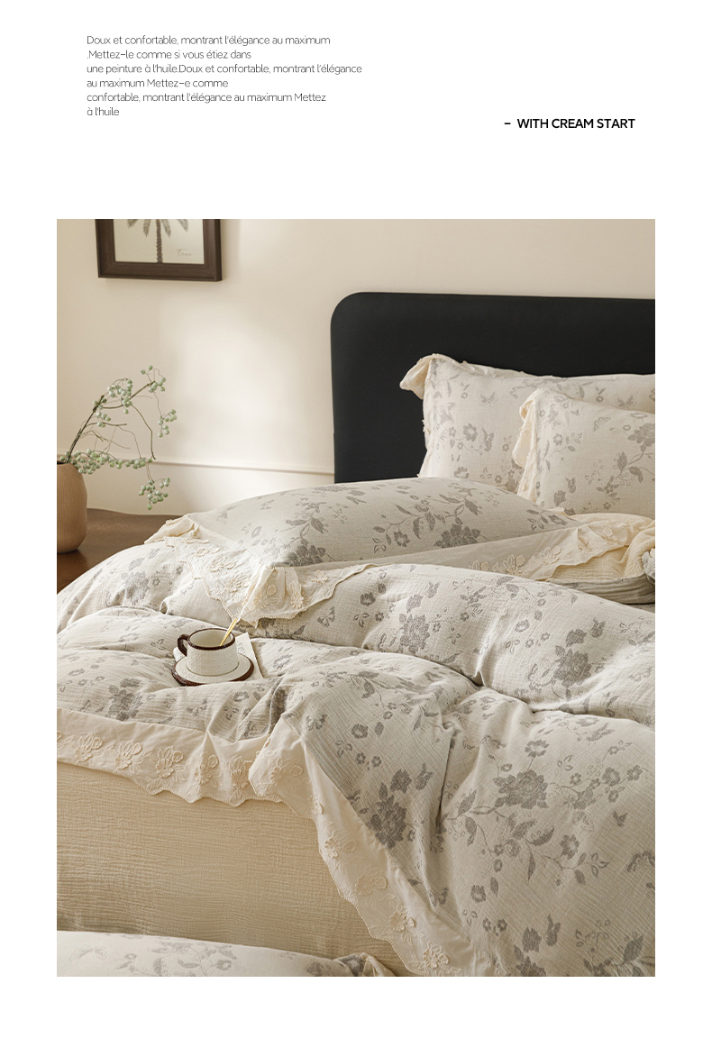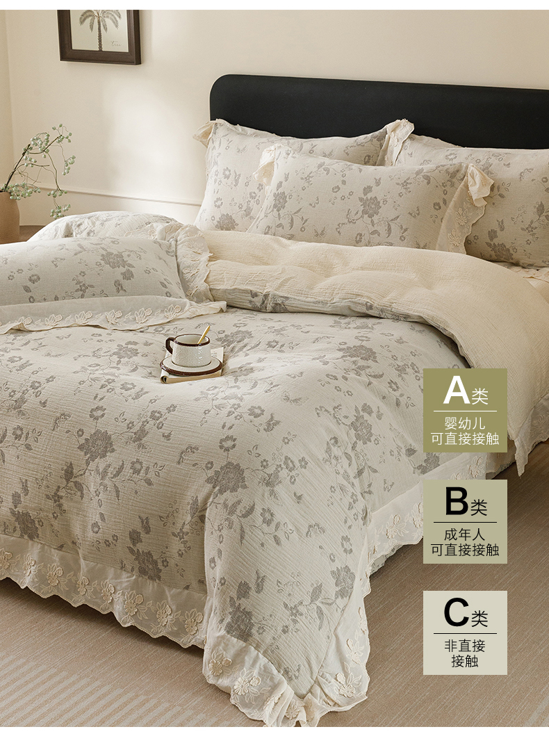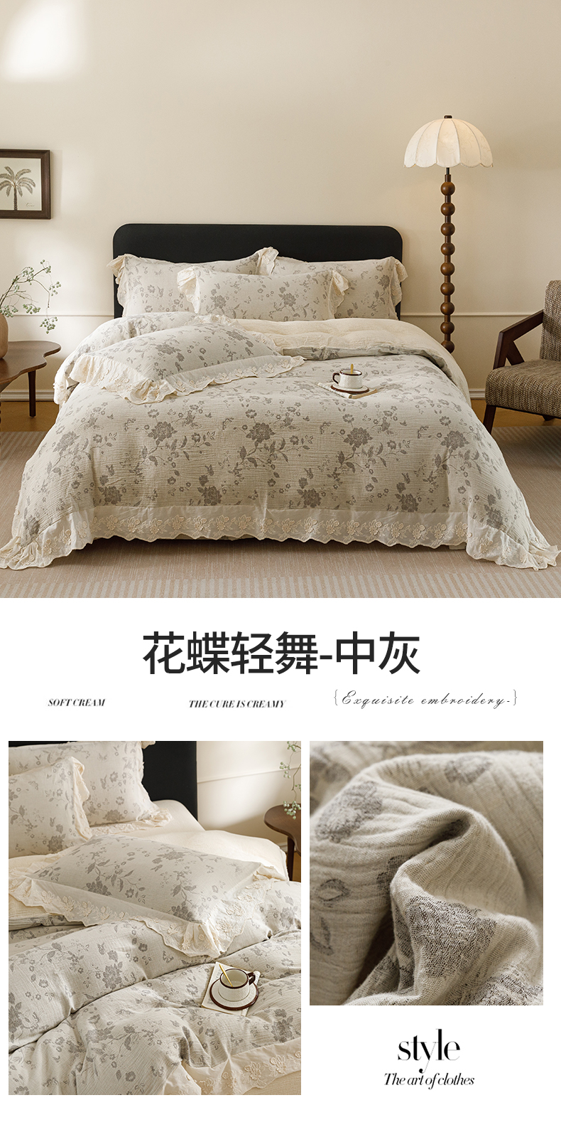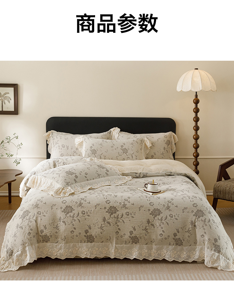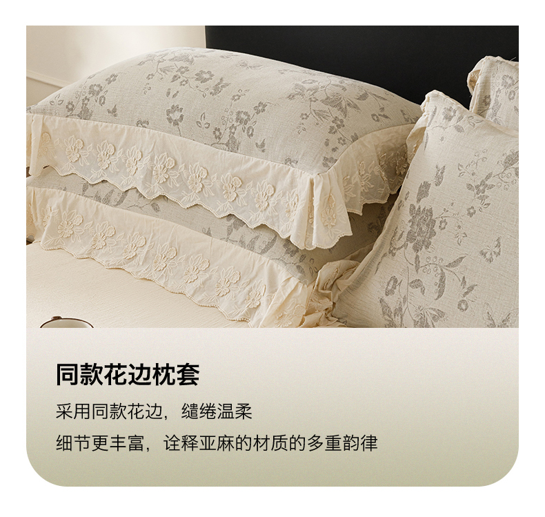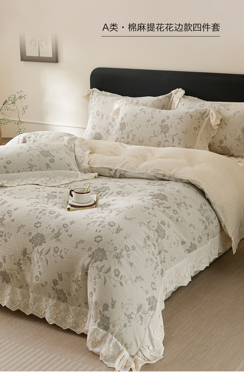 商品名称:瑞米家居 2026新款A类棉麻提花花边款四件套-花蝶轻舞 花蝶轻舞-中灰