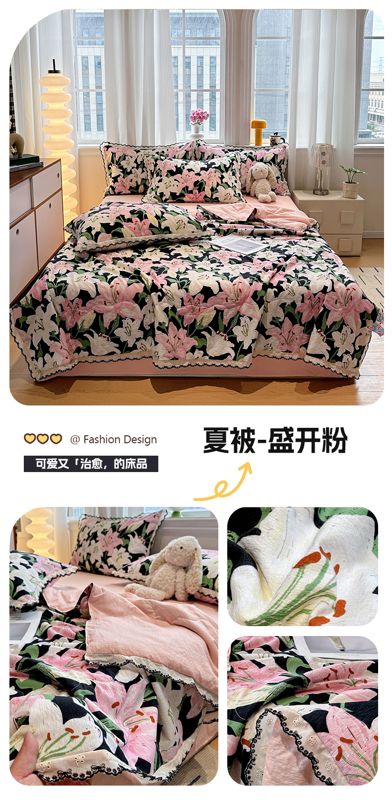 • 91家纺网 家纺一手货源 找家纺 花伞家居 2026新款蕾丝花边皱皱双层纱夏被四件套含买家秀 夏被-热情绚烂