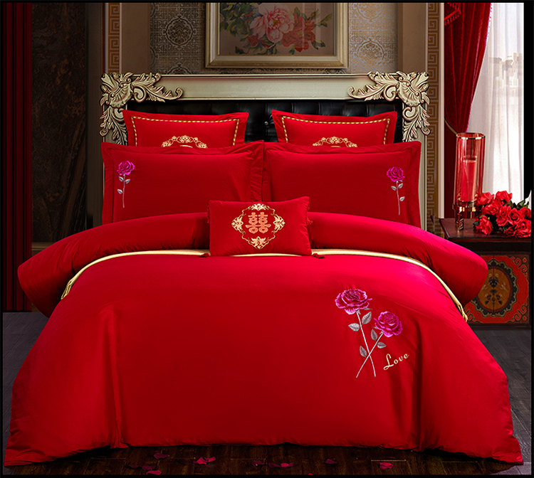 慕她家纺 简约婚庆四件套大红色刺绣全棉纯棉六多件套爱情玫瑰