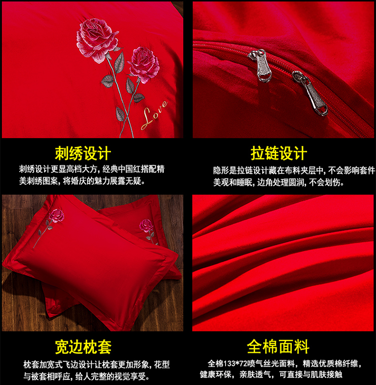 商品名称:慕她家纺 简约婚庆四件套大红色刺绣全棉纯棉六多件套爱情玫瑰