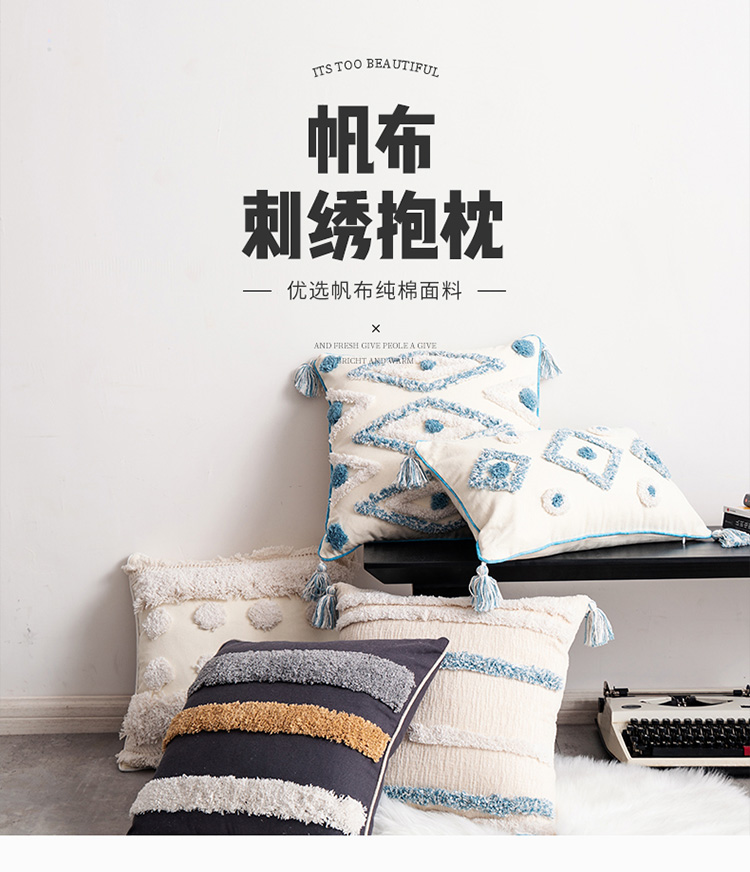 美茉家居 2022新品印度手工线绣流苏抱枕纯棉帆布刺绣靠垫