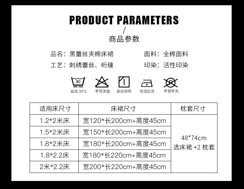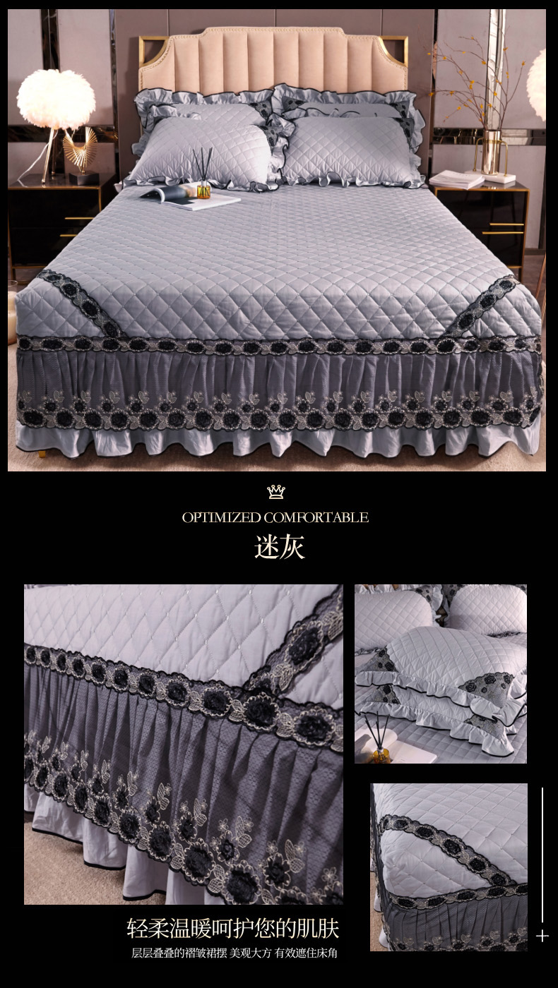 商品名称:新品时尚芭莎宫廷风黑色刺绣蕾丝款全棉133*72夹棉床裙迷灰