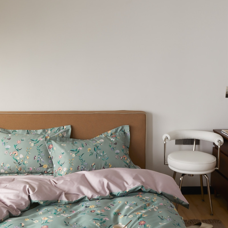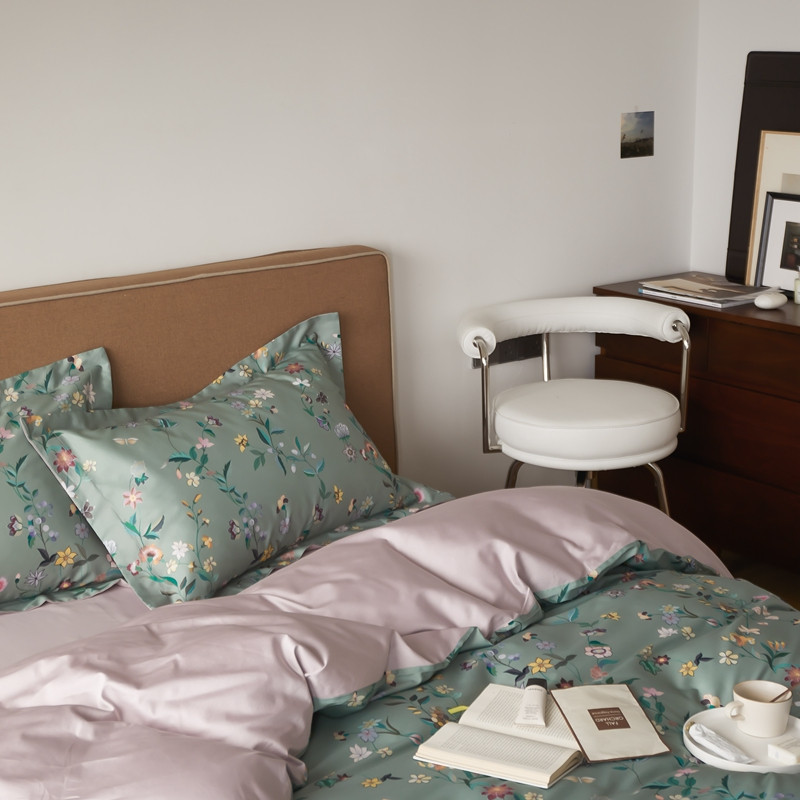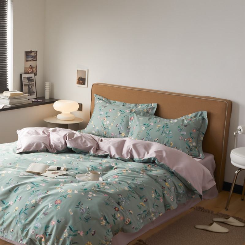 (总)优然居家纺 2025新款50支全棉纯棉印花法式双头木耳边四件套,觅棠,莫妮卡艾绿,莫妮卡罗兰,慕斯粉,薇薇安