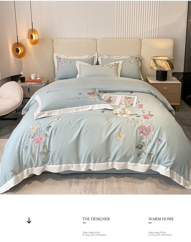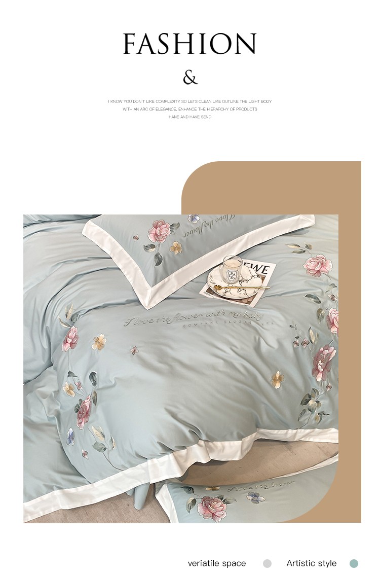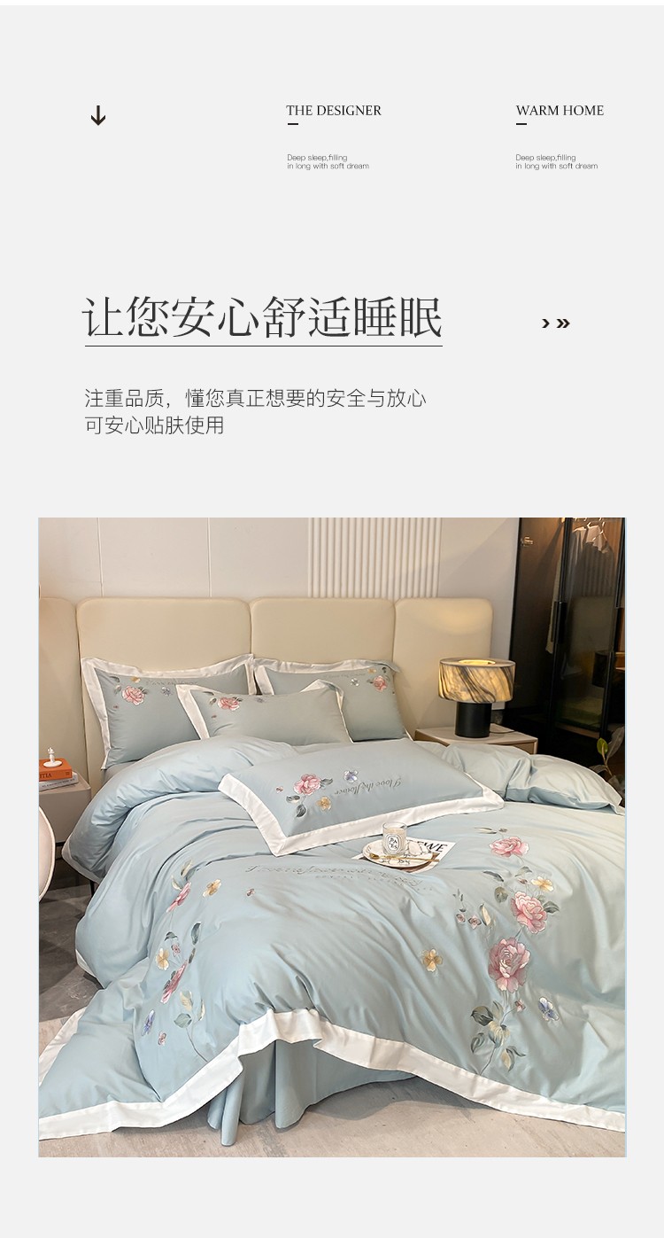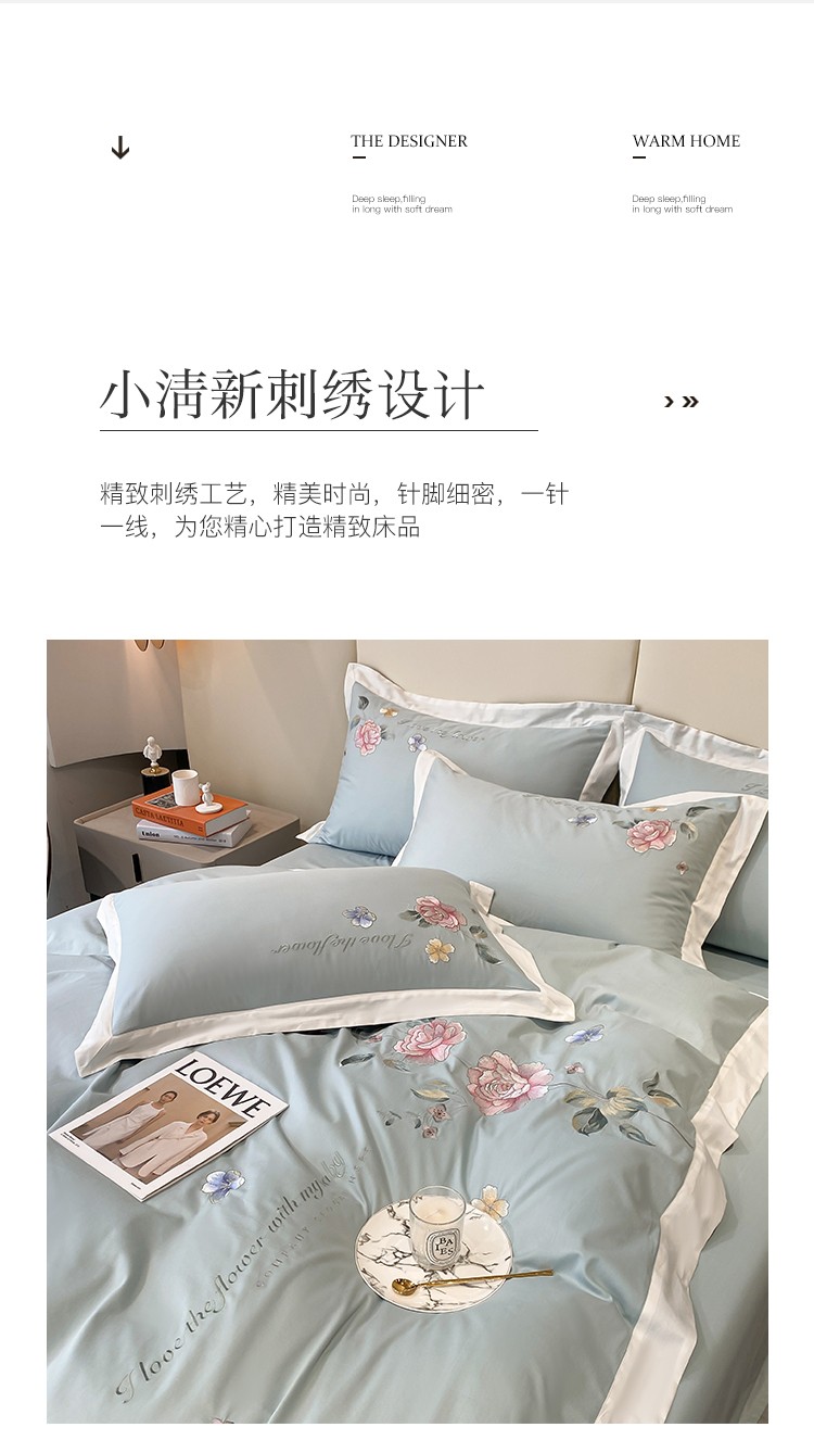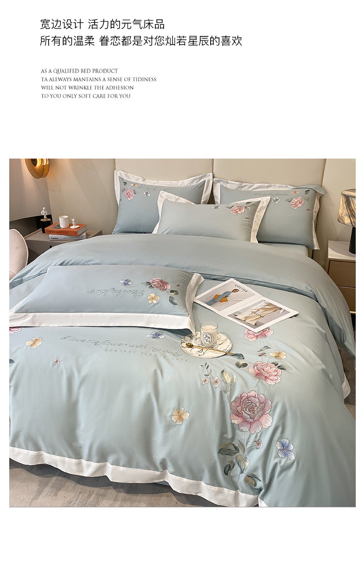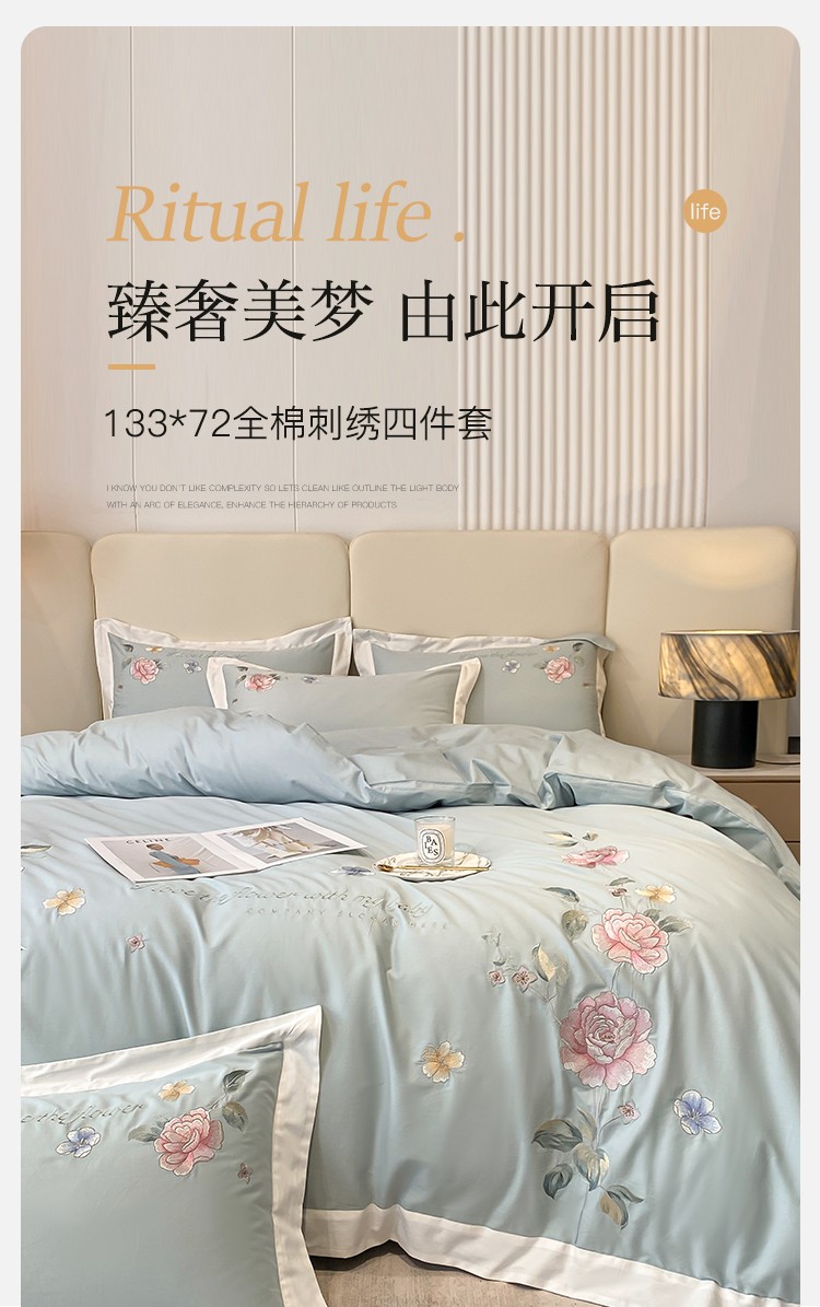 (总)理想家家纺 2025新款纯棉轻奢刺绣四件套--心愿系列场景二,心愿粉,心愿红,心愿黄,心愿蓝