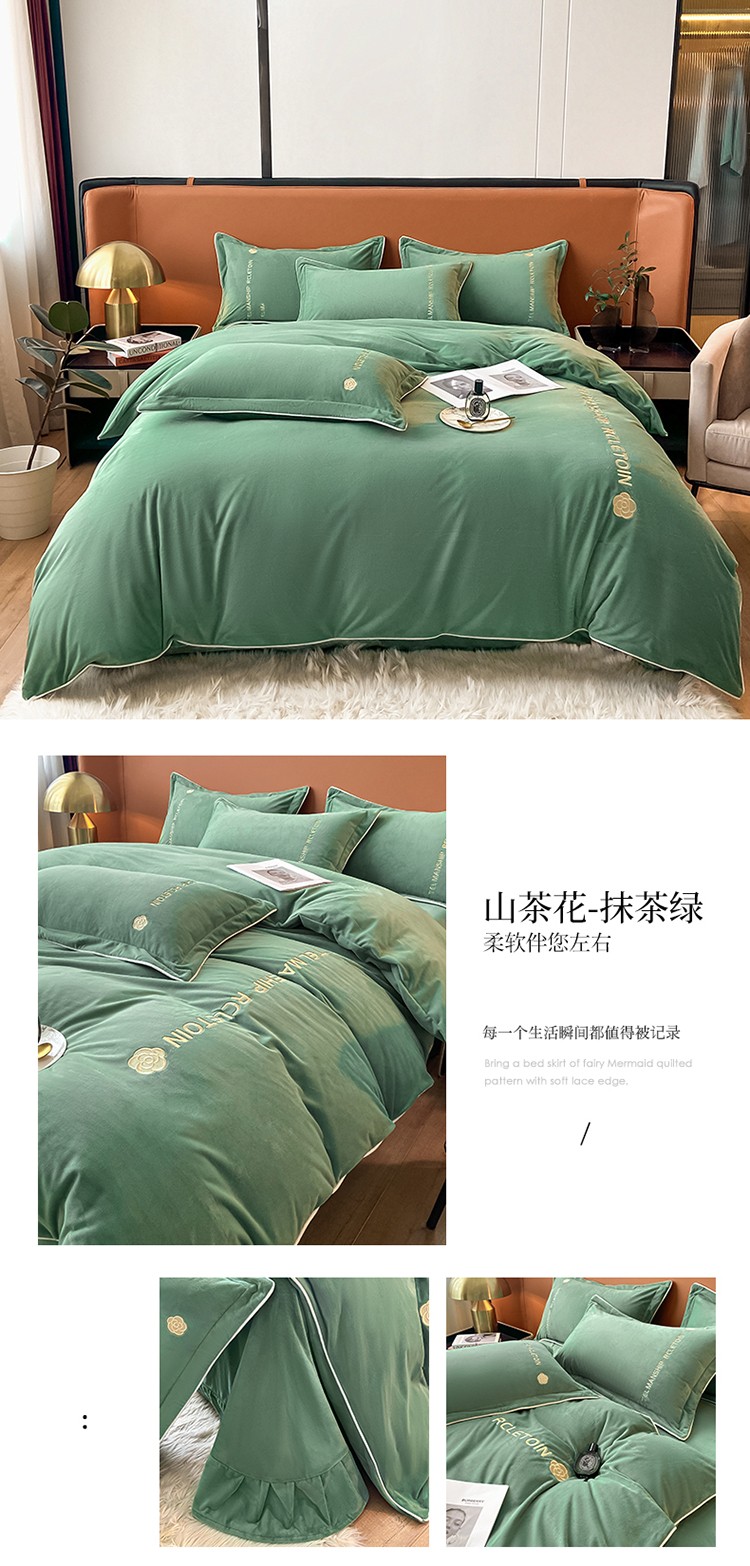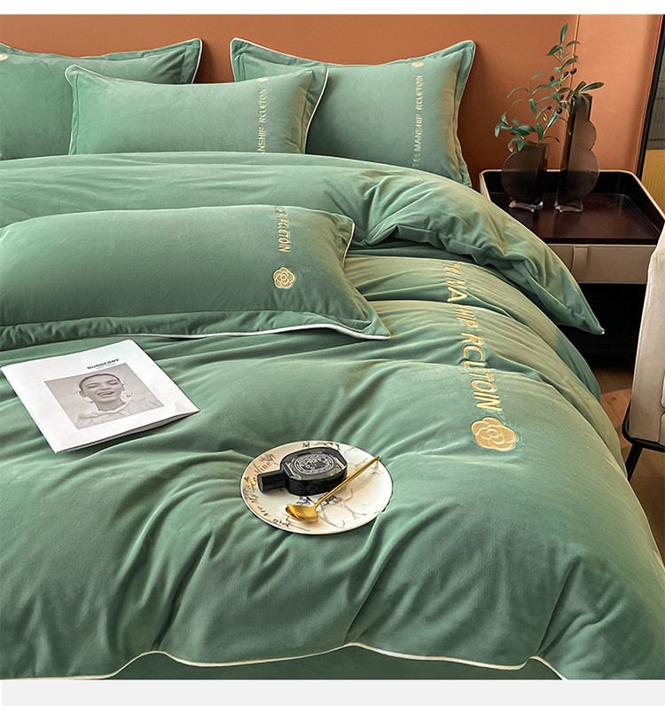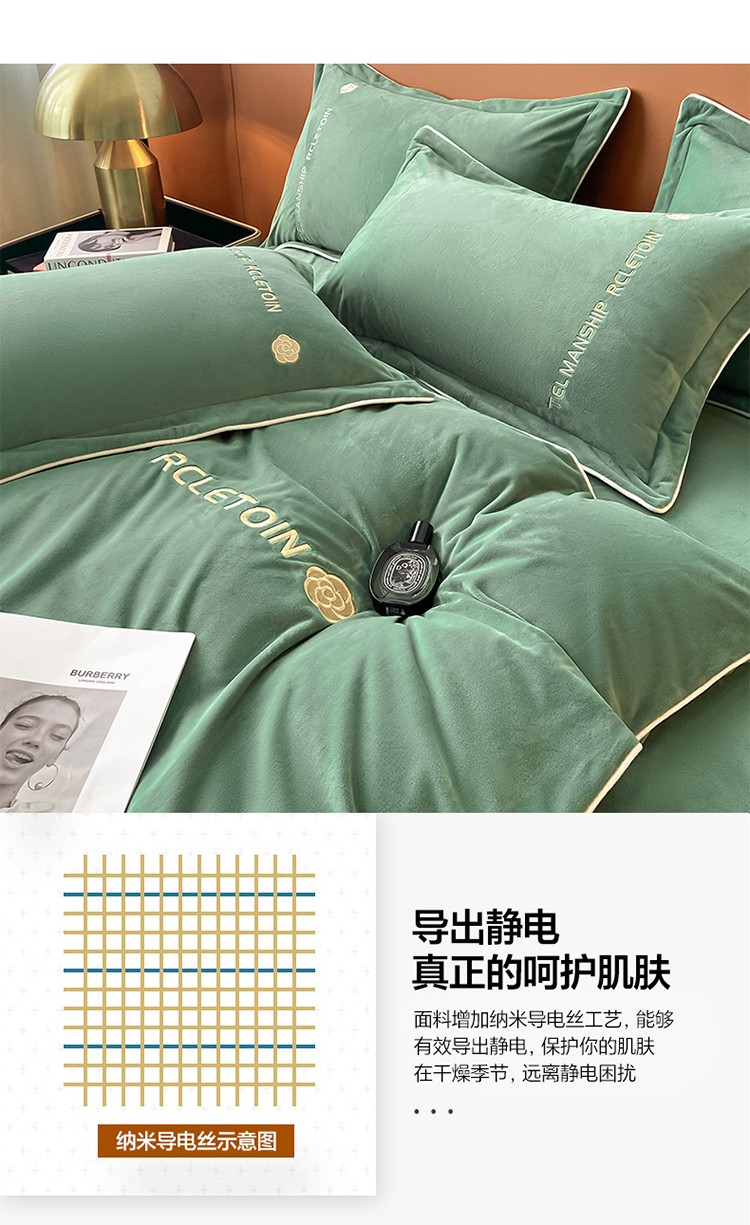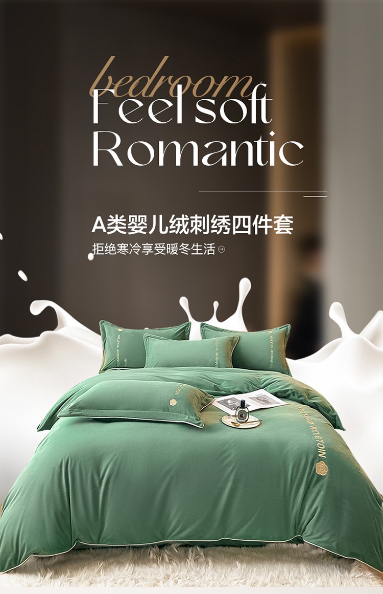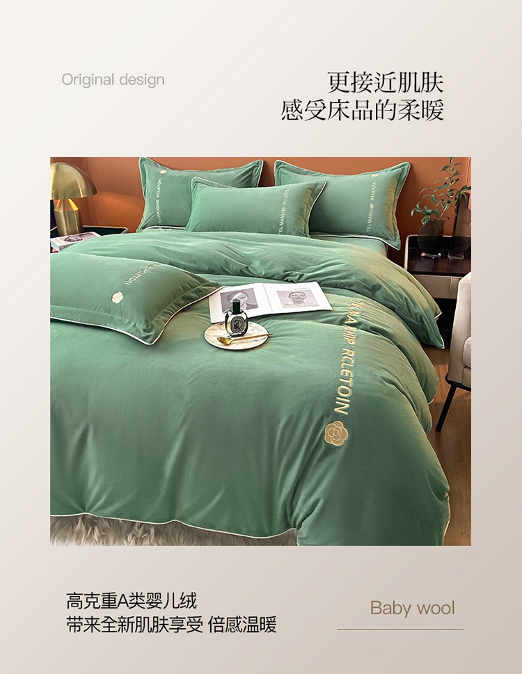 商品名称:嗯呢 2023新款A类高克重轻奢刺绣婴儿绒四件套 抹茶绿