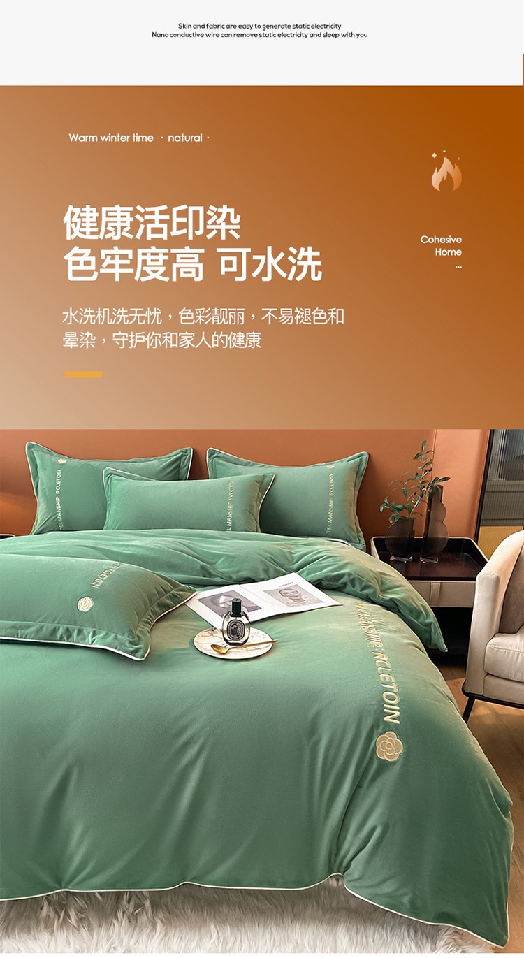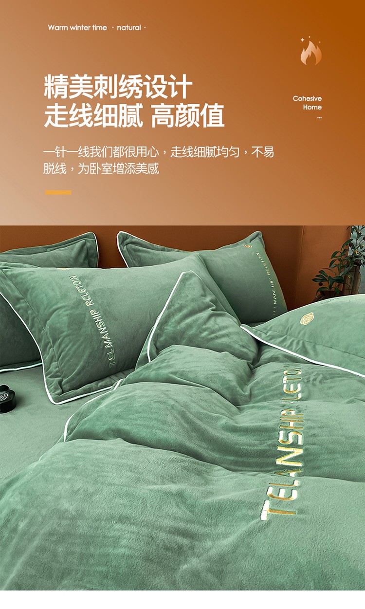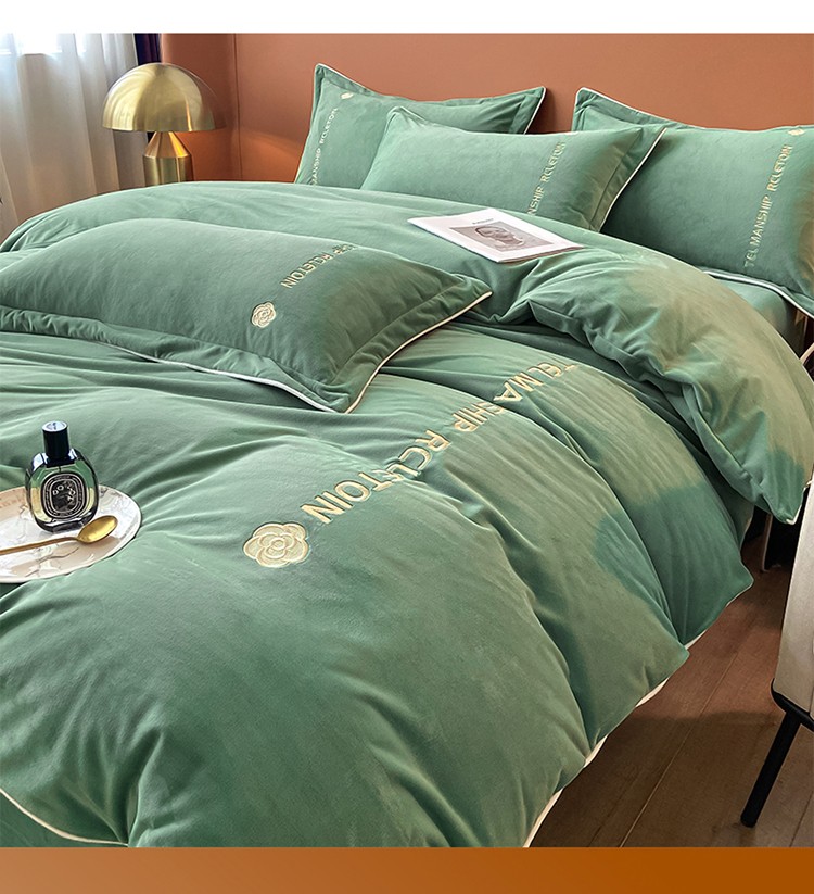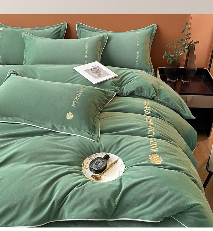 商品名称:嗯呢 2023新款A类高克重轻奢刺绣婴儿绒四件套 抹茶绿