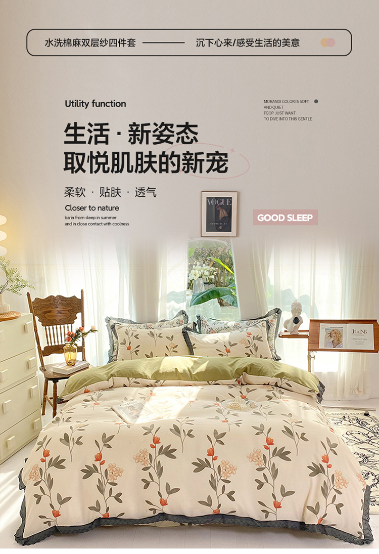 商品名称:艾米 2023新款水洗棉麻双层纱系列四件套 芳华