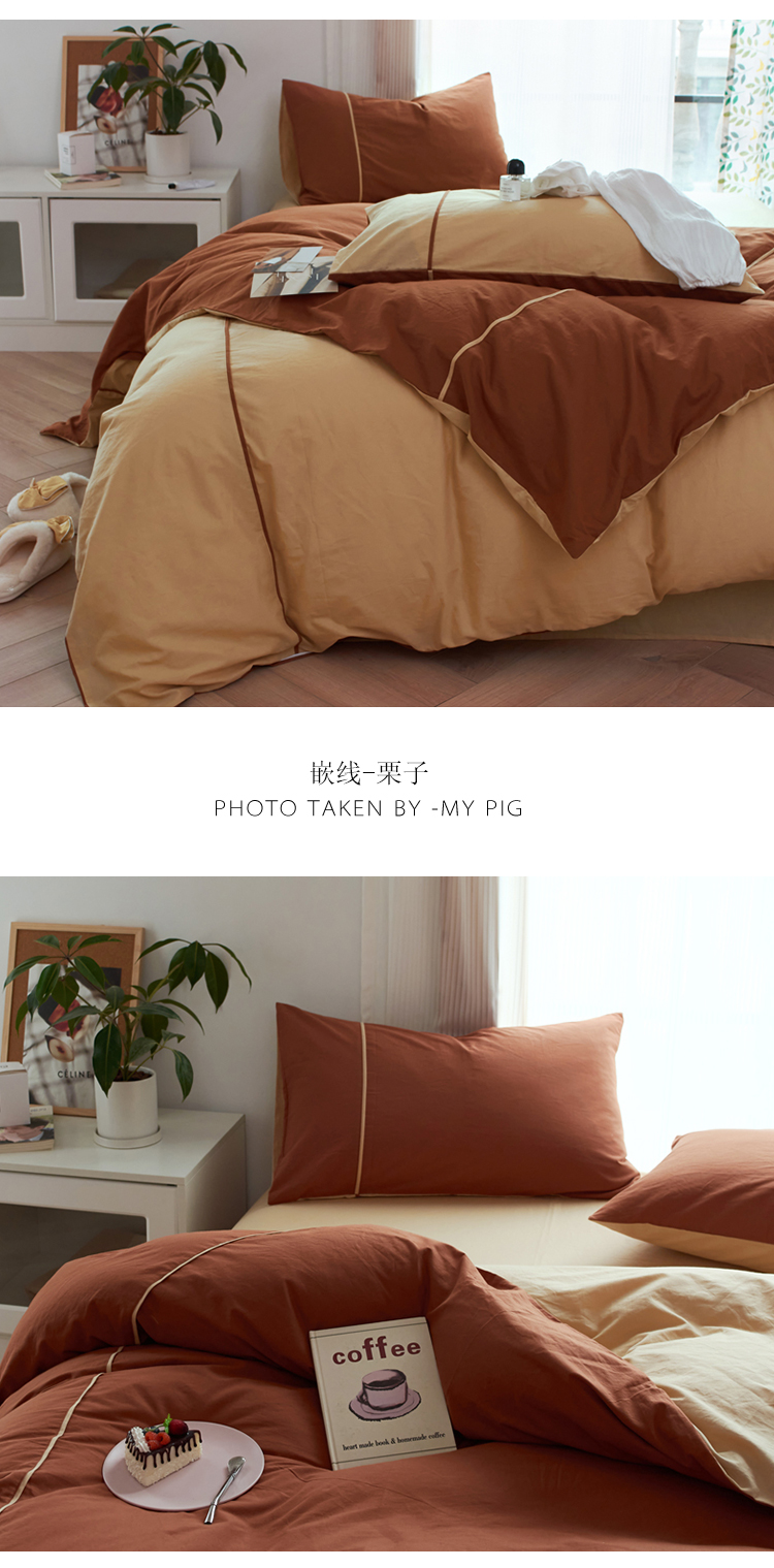 纯棉水洗棉四件套纯色简约全棉被套工艺款床单床笠学生直播爆款 嵌线-黄桃