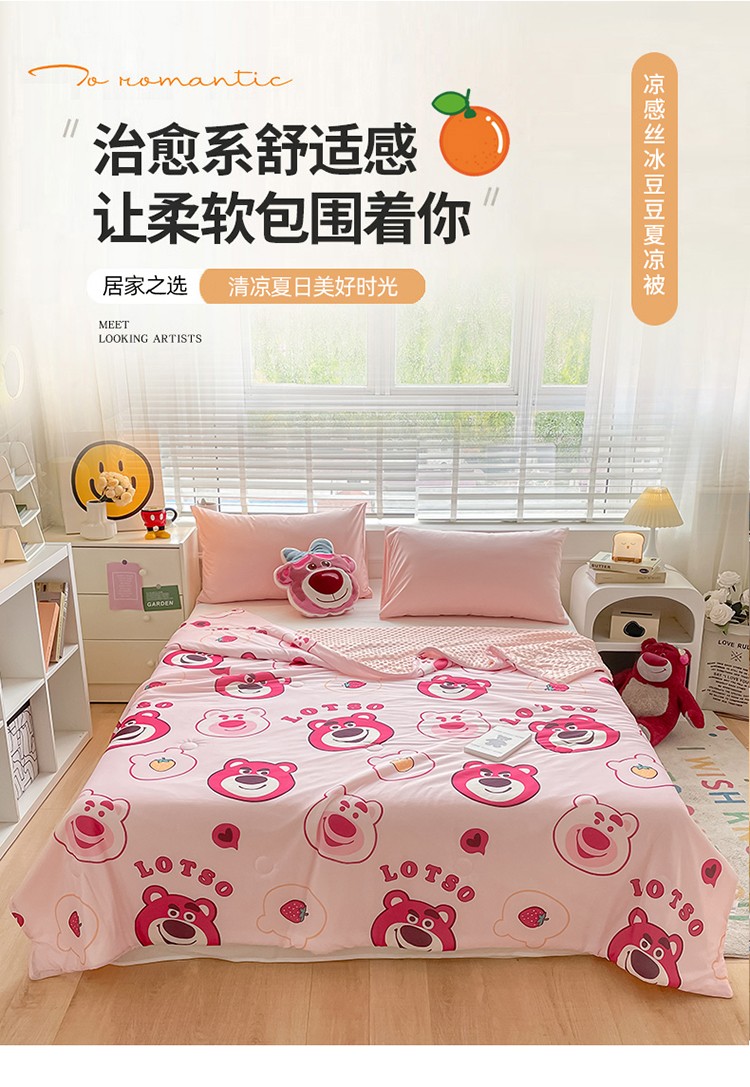 (总)大彩家居2023凉感丝豆豆被夏被被子夏凉被空调被,胖胖草莓熊,爱心米妮,怪兽大学,花花史迪仔,蓝色米奇,维尼森林,草莓花花,荷塘月色,花间密语,花沫,浪漫花园,生如夏花,小熊花花,郁金小熊