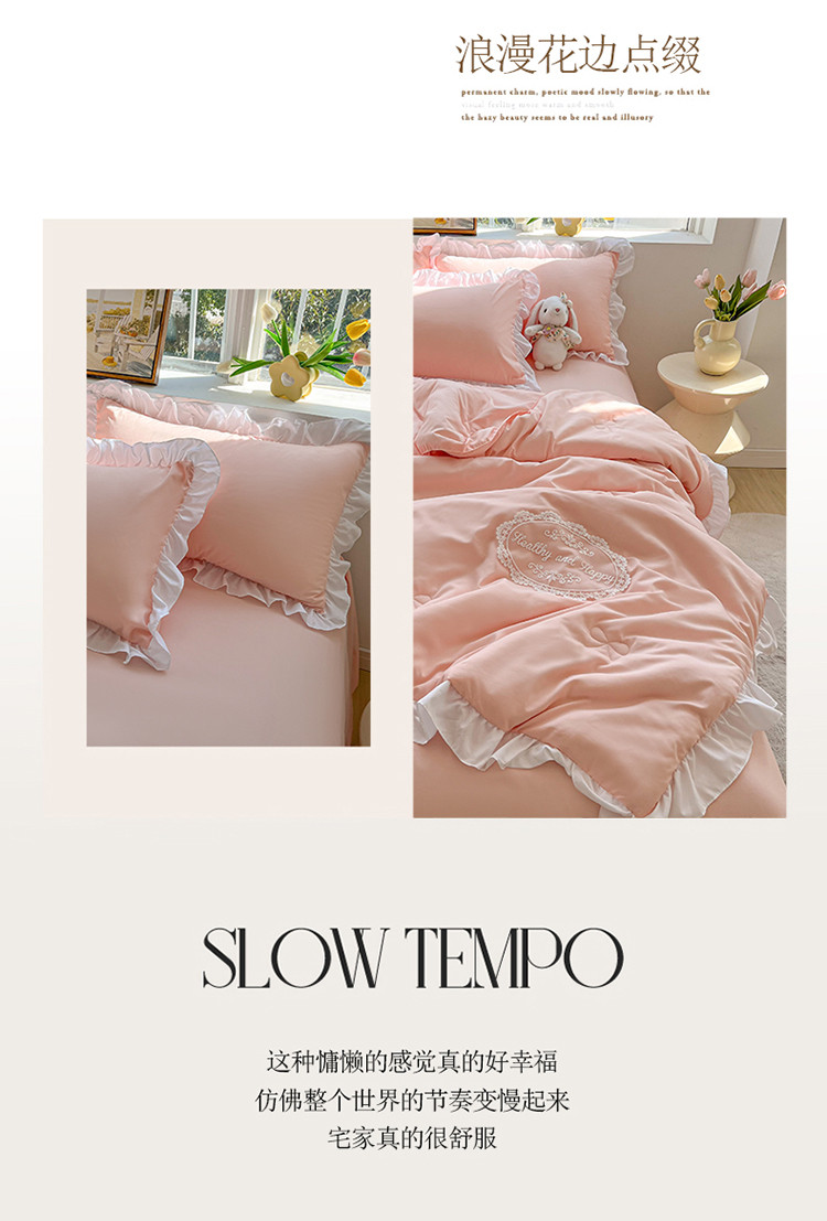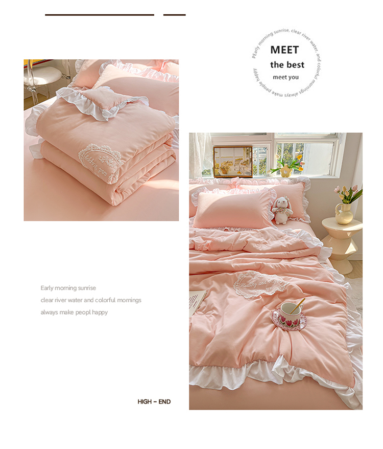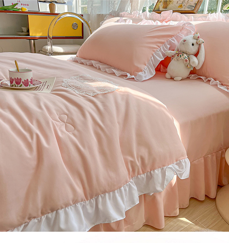 十里居 2023新款水洗棉麻蕾丝韩版床裙夏被四件套 仙子粉