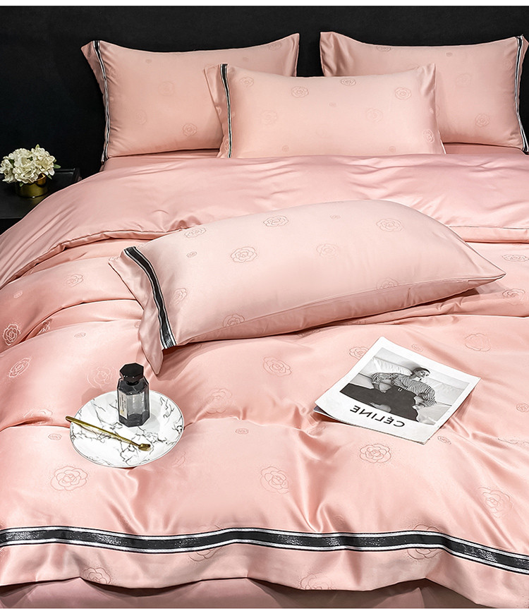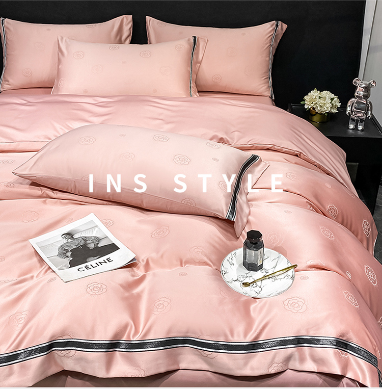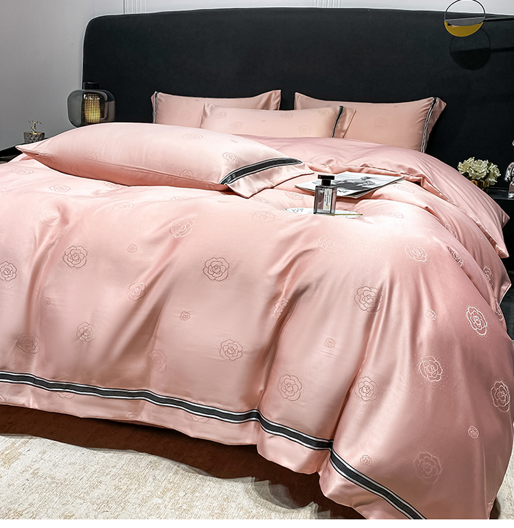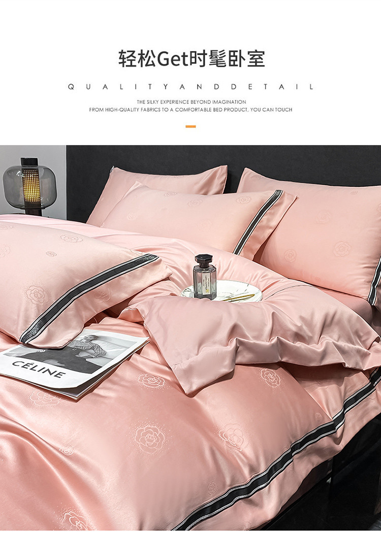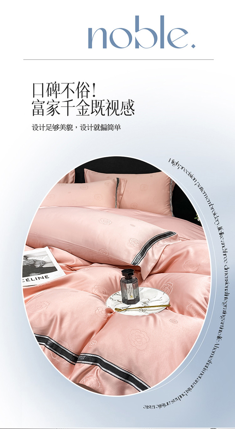 宅家居2023新款设计款轻奢高精密贡缎提花臻品真丝四件套 山茶花-粉玉