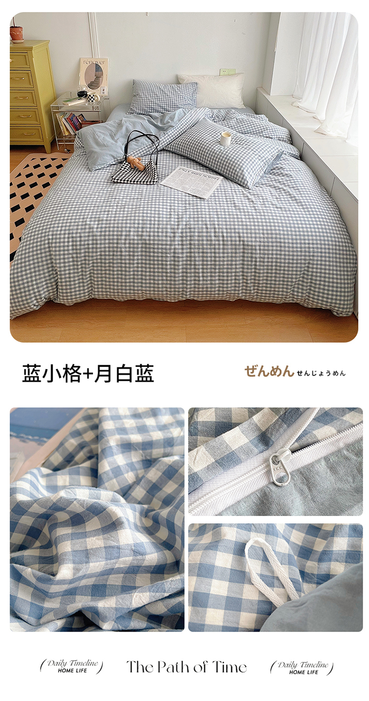 商品名称:北欧良品 2023新款AB版水洗棉四件套 蓝小格+月白蓝