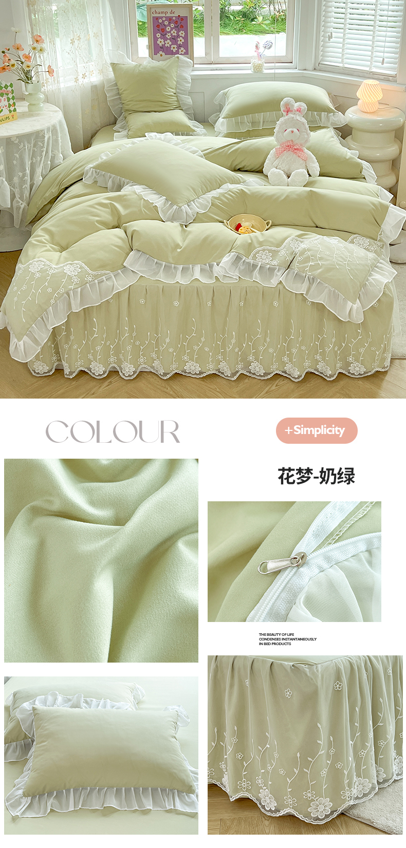 芭比蔓家纺 2024新款雪纺花边床裙四件套-花梦系列 花梦-奶绿