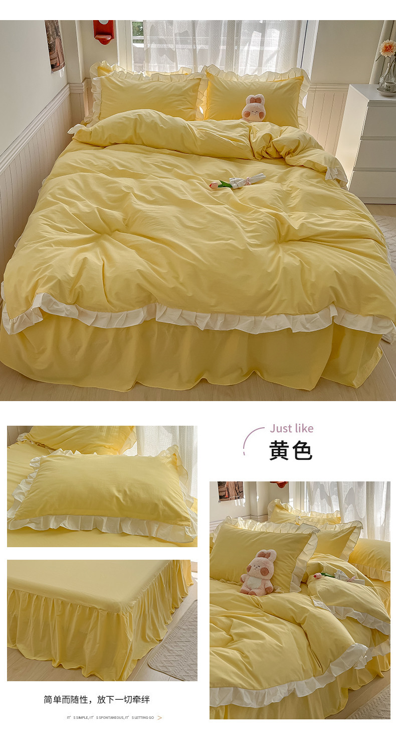当前位置: 91家纺网 > 商品网购 > 床品套件 > 四件套 > 水洗棉四件套 > 盼季 2023新款小清新温柔公主风水洗棉四件套 花边纯色-奶黄