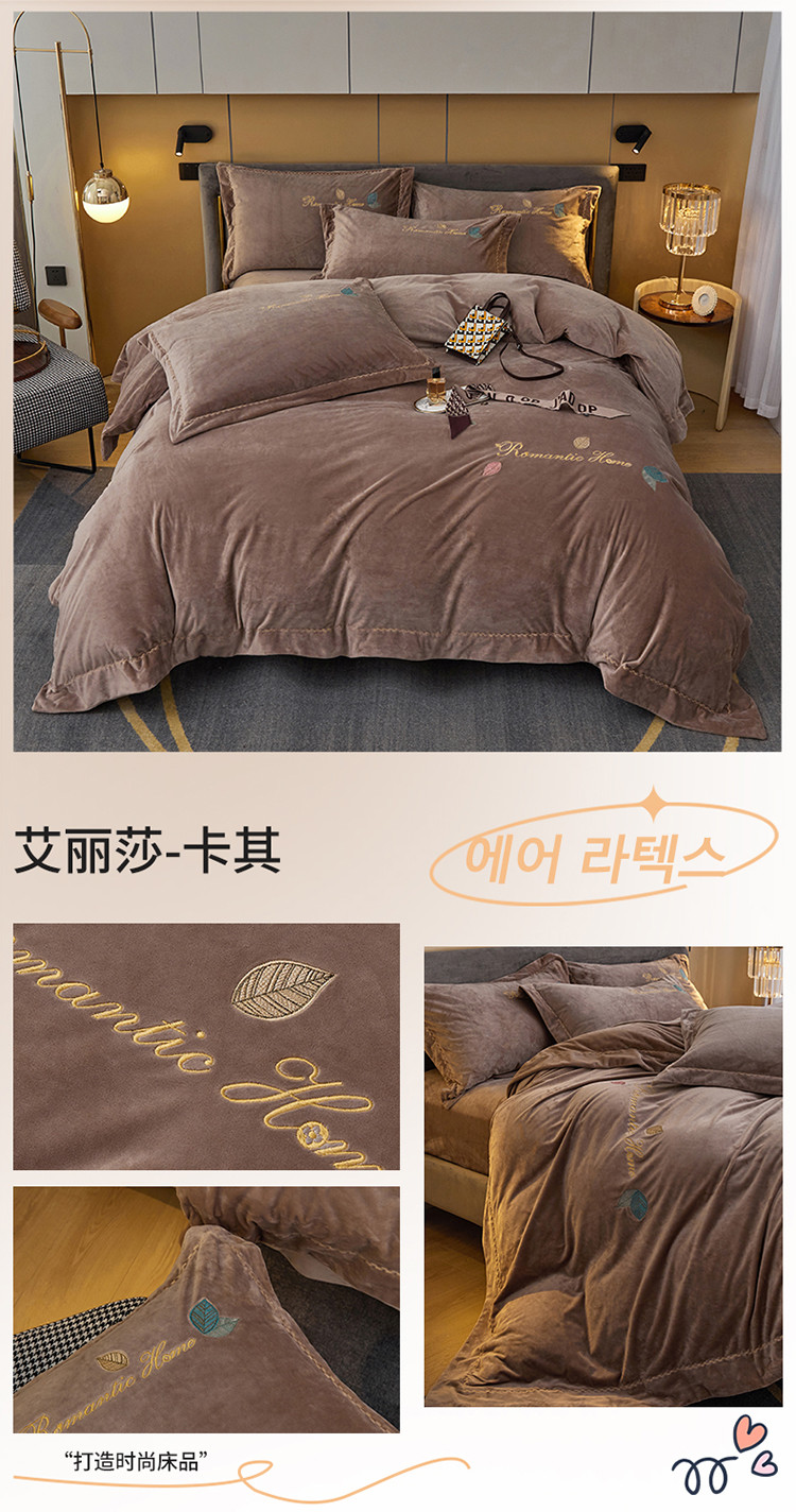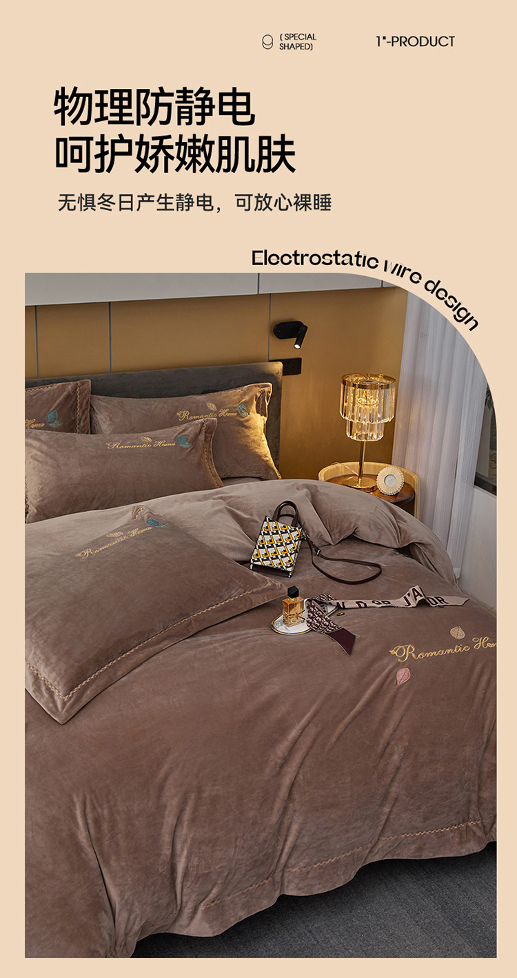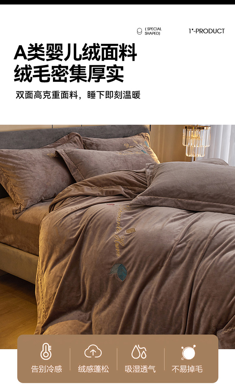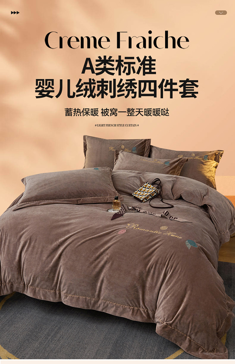 当前位置: 91家纺网 > 商品网购 > 床品套件 > 四件套 > 磨绒四件套 > 瑞驰家纺 2023新款A类婴儿绒刺绣加厚保暖四件套—艾丽莎 艾丽莎-卡其