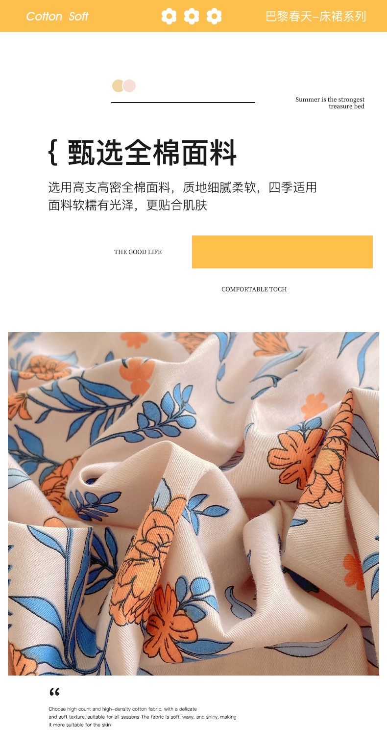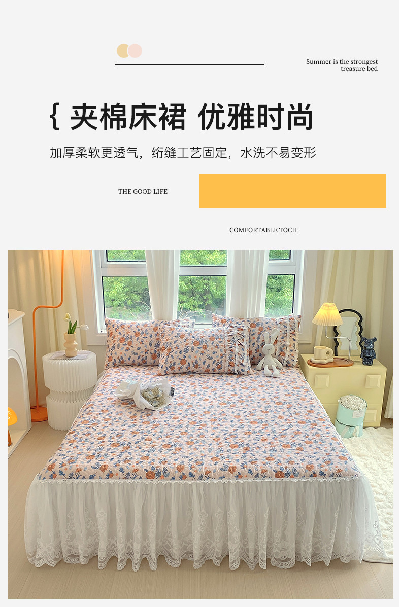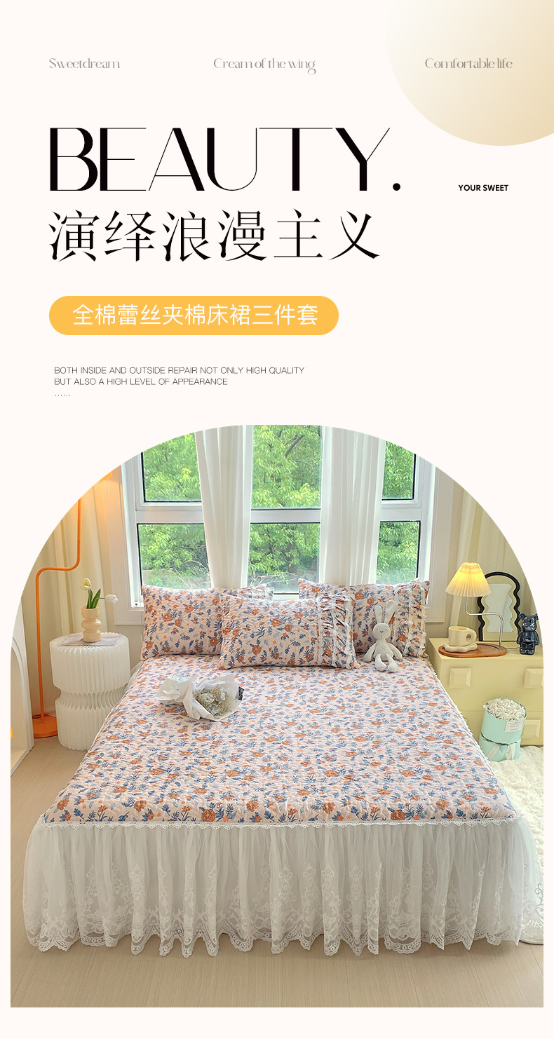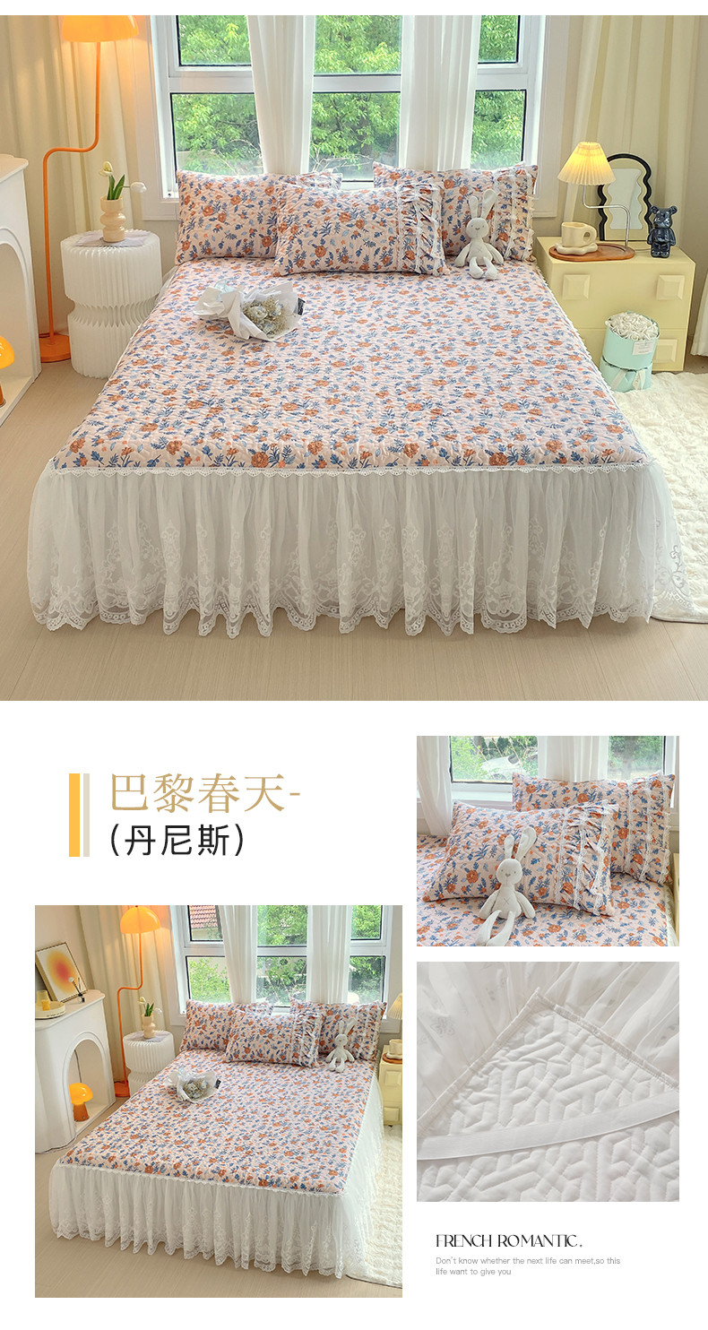 • 91家纺网 家纺一手货源 找家纺 罗艺轩 2024新款全棉蕾丝夹棉床裙巴黎春天系列三件套 丹尼斯