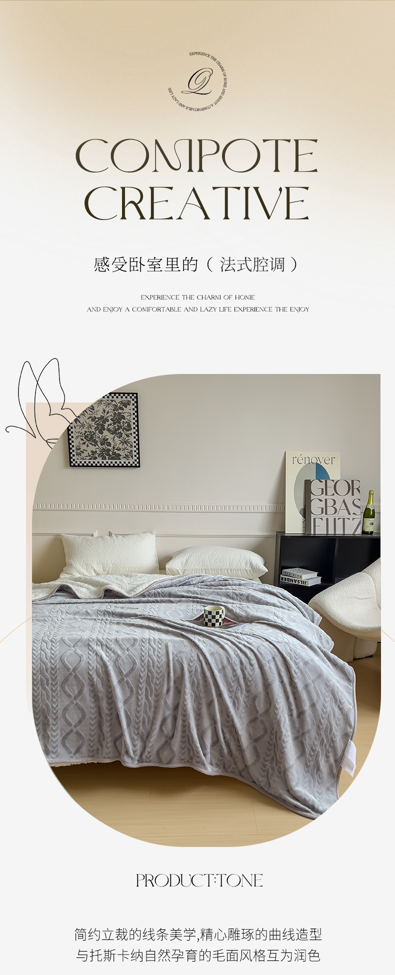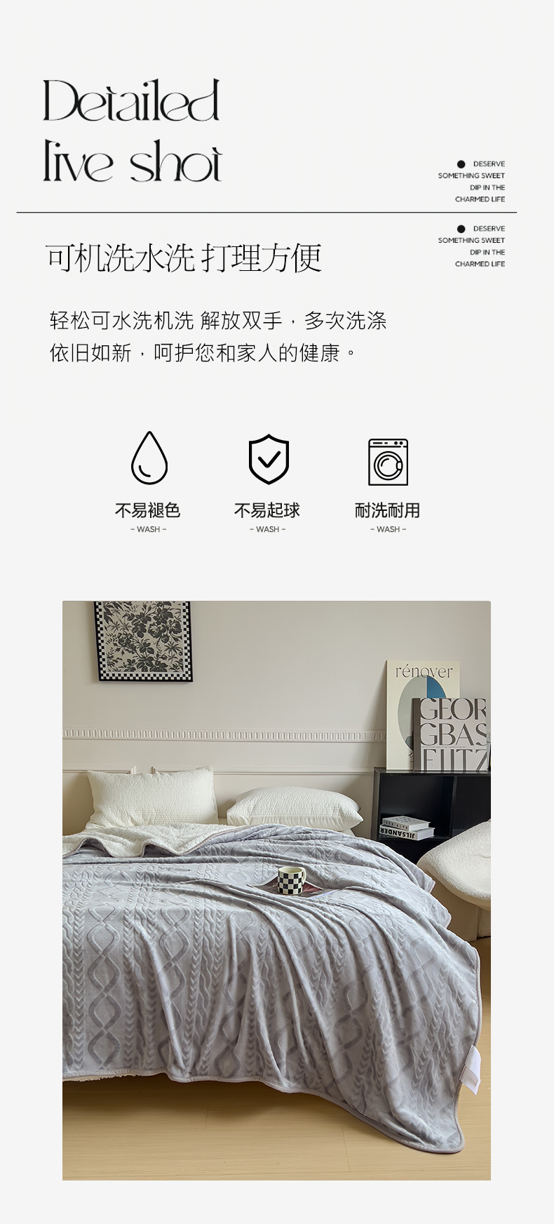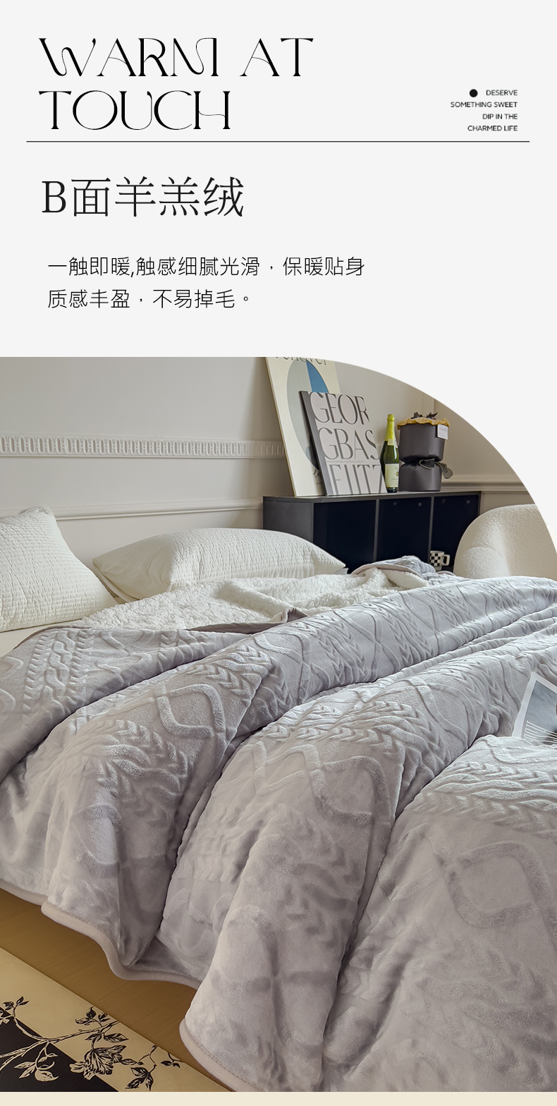 (总)宜家坊 2023新款秋冬高克重法莱绒羊羔绒立体剪花纯色多功能毛毯,奶油白,浅奶咖,绅士灰,胭脂粉,烟灰蓝,优雅棕