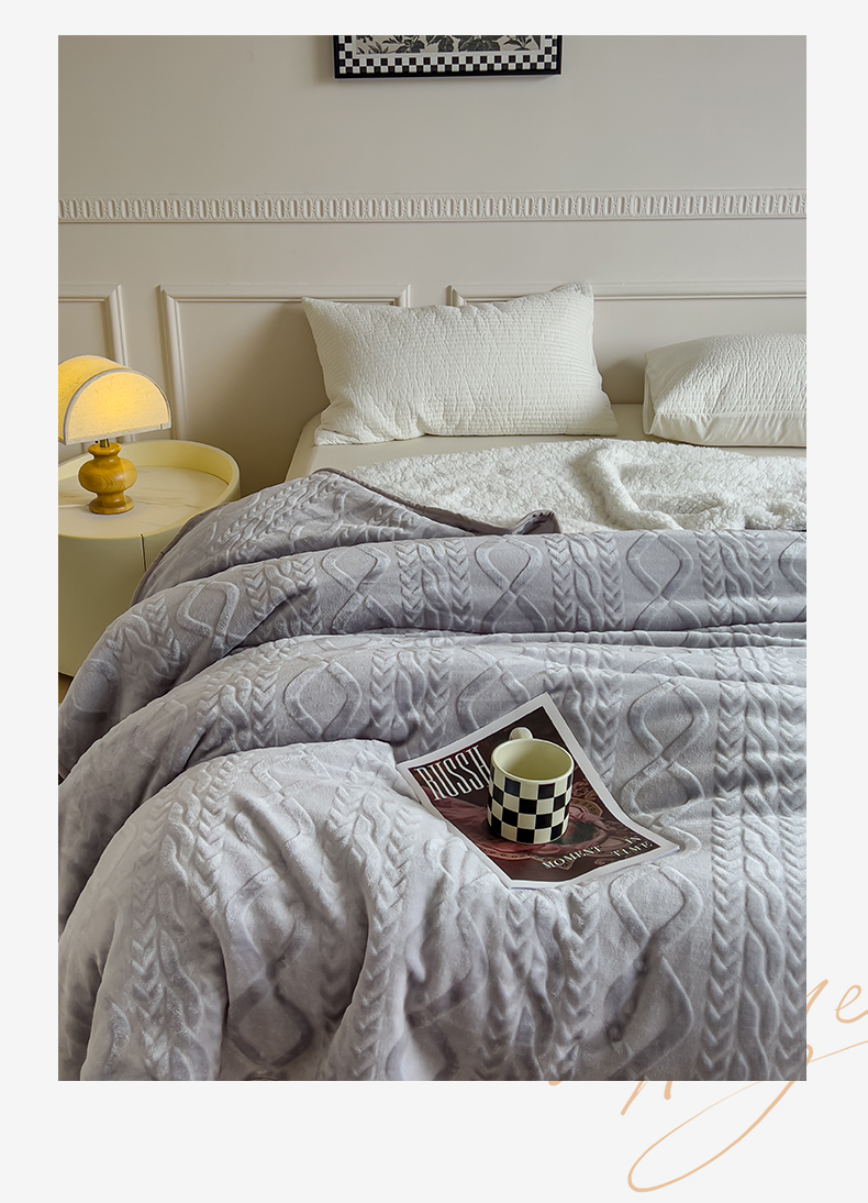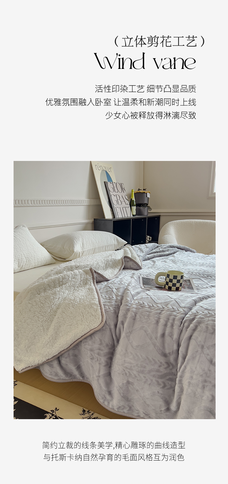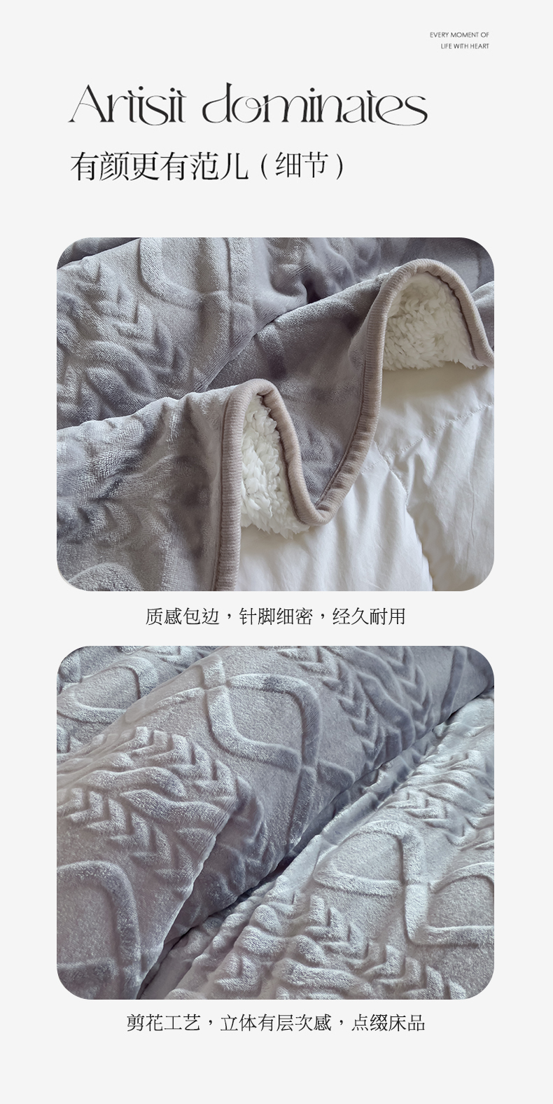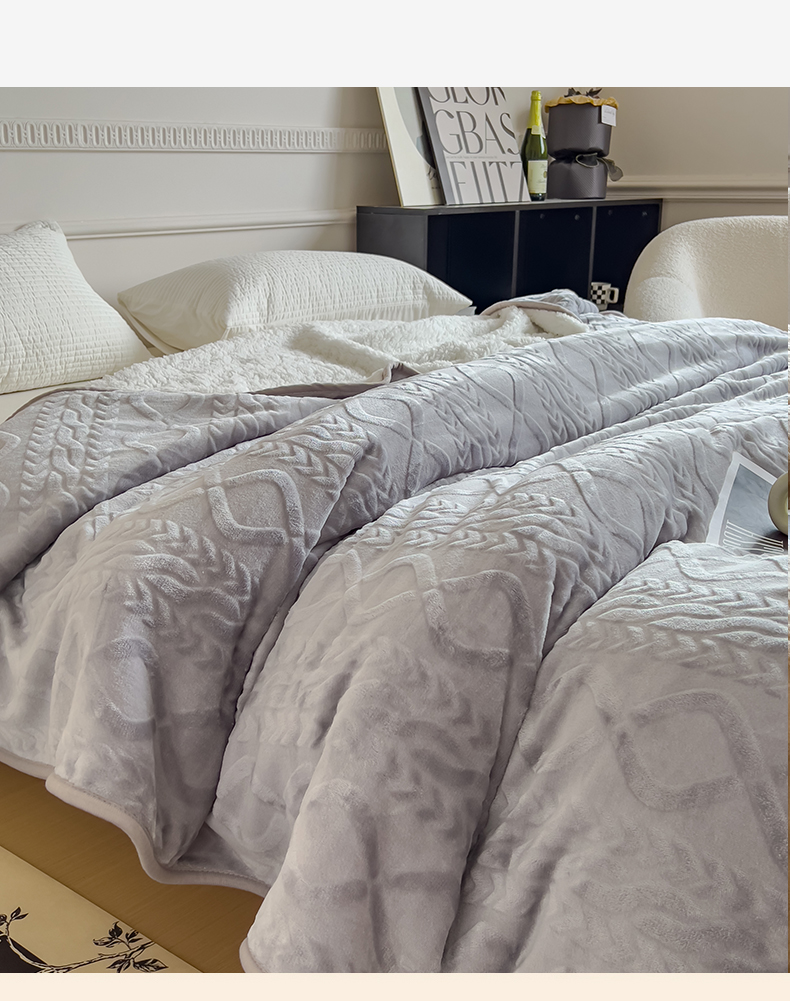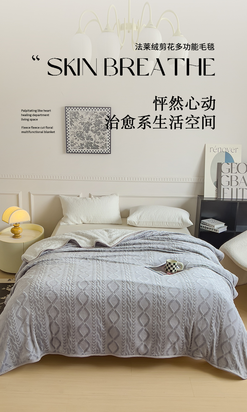 宜家坊新款秋冬高克重法莱绒羊羔绒立体剪花纯色多功能毛毯 烟灰蓝