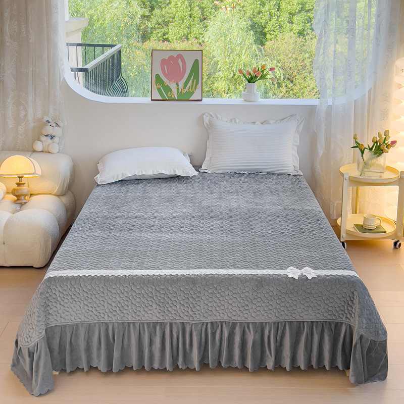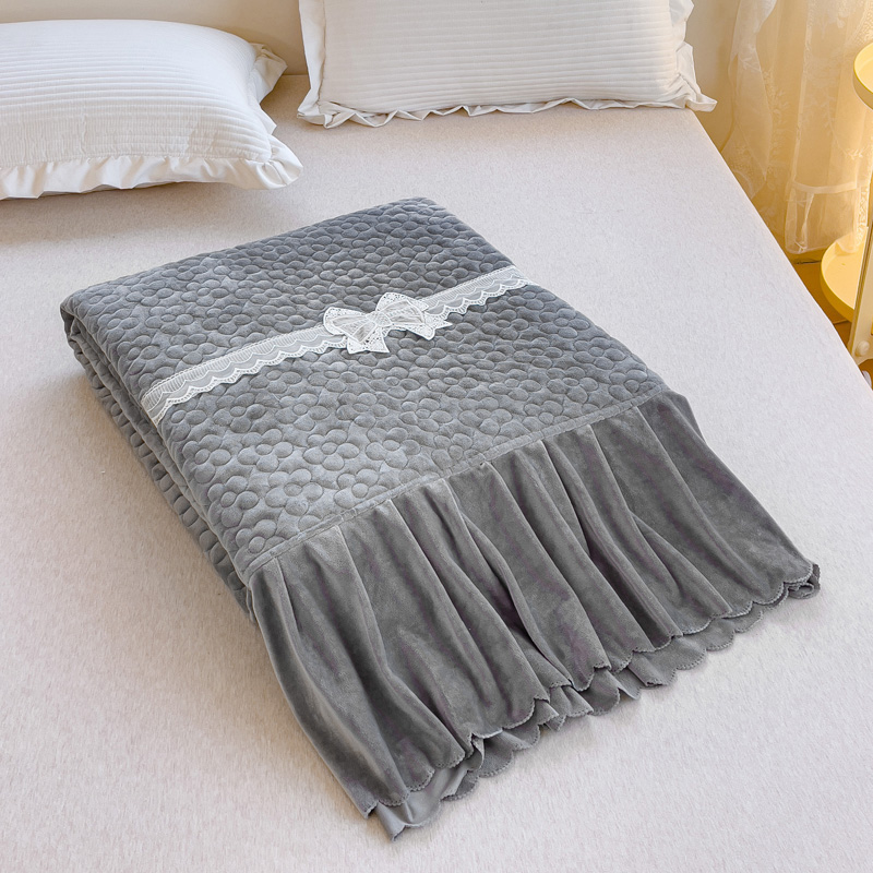 2023直播爆款纯色牛奶绒床盖床裙款蕾丝边素色婴儿绒床盖 蝴蝶结-雾灰