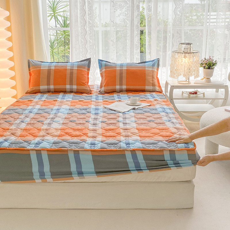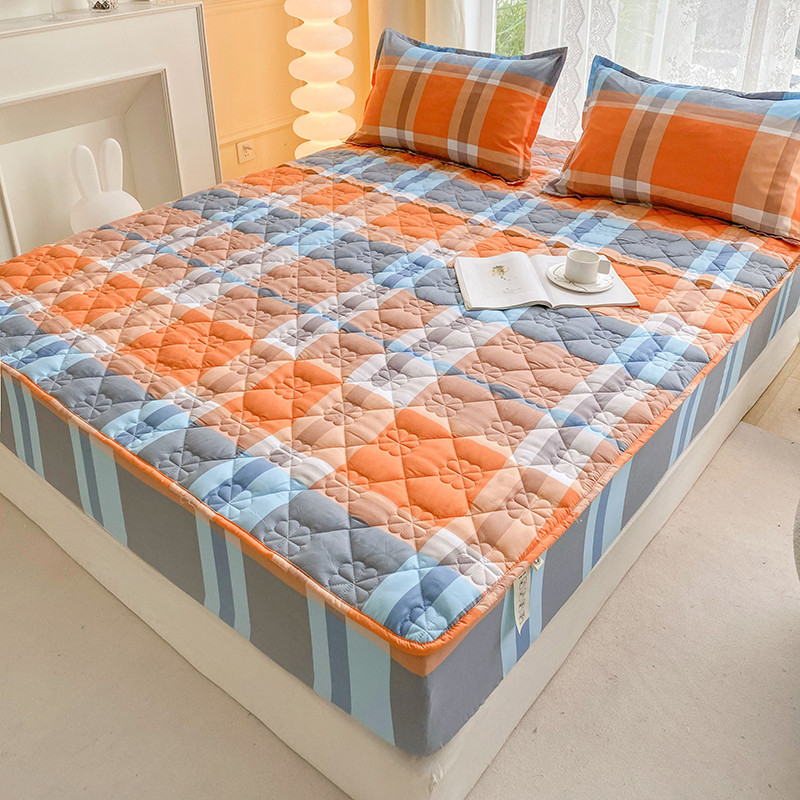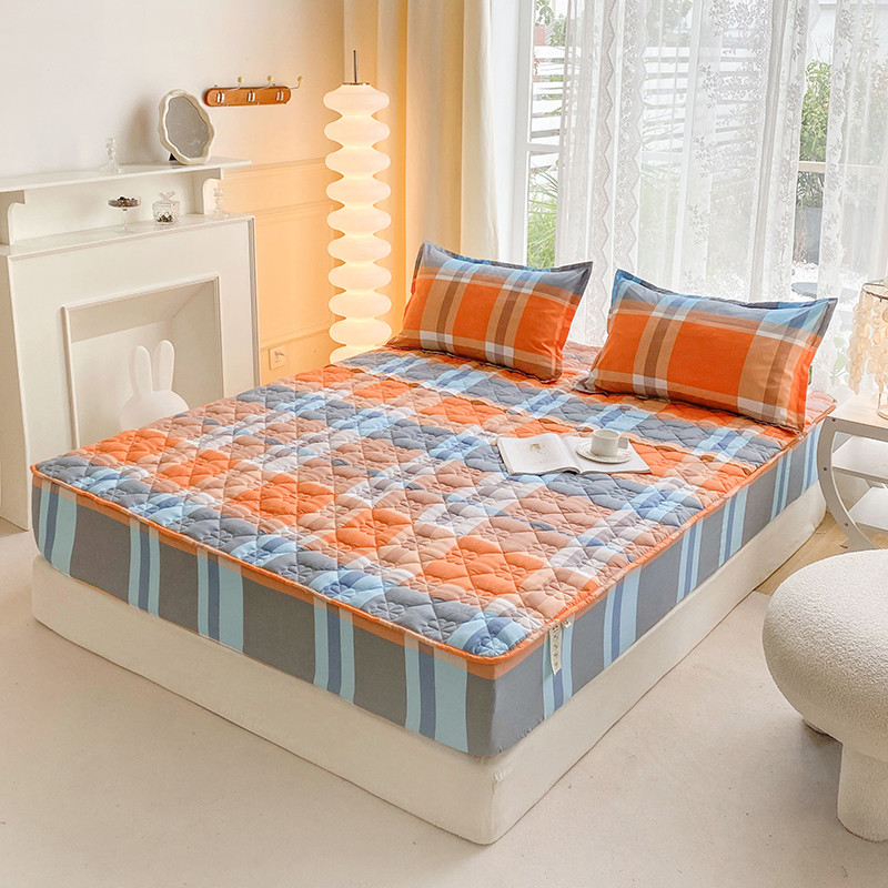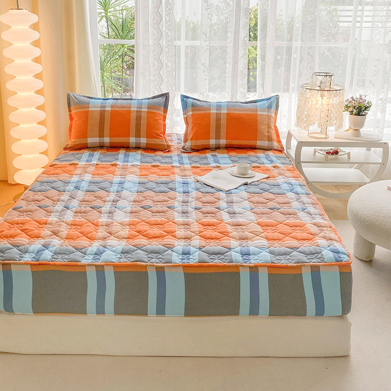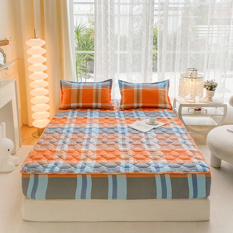 米柳 2024新款亲肤夹棉印花床笠 兰橘大格