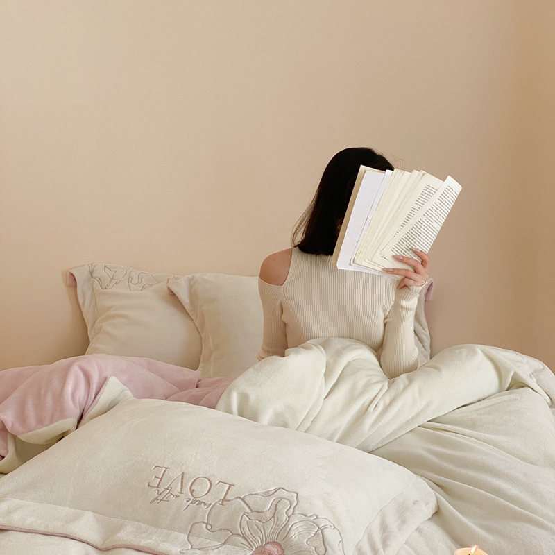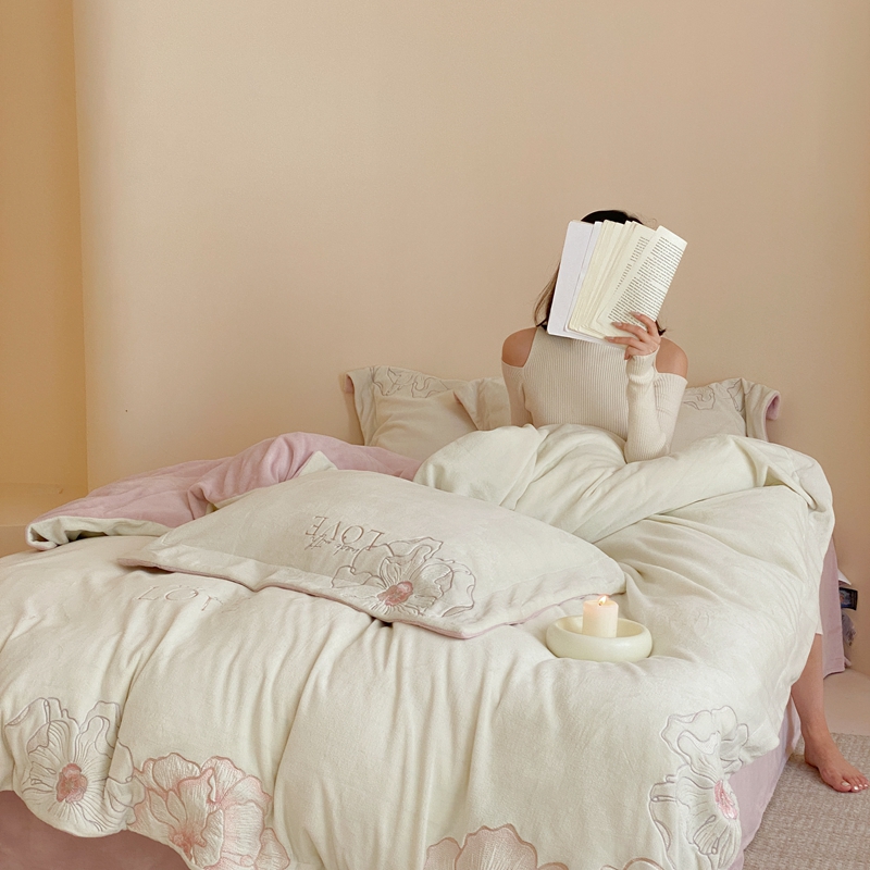 馨蕊家居 2023新款300克极细腻超柔煦暖绒进口导电丝四件套-花恋 花恋-粉白