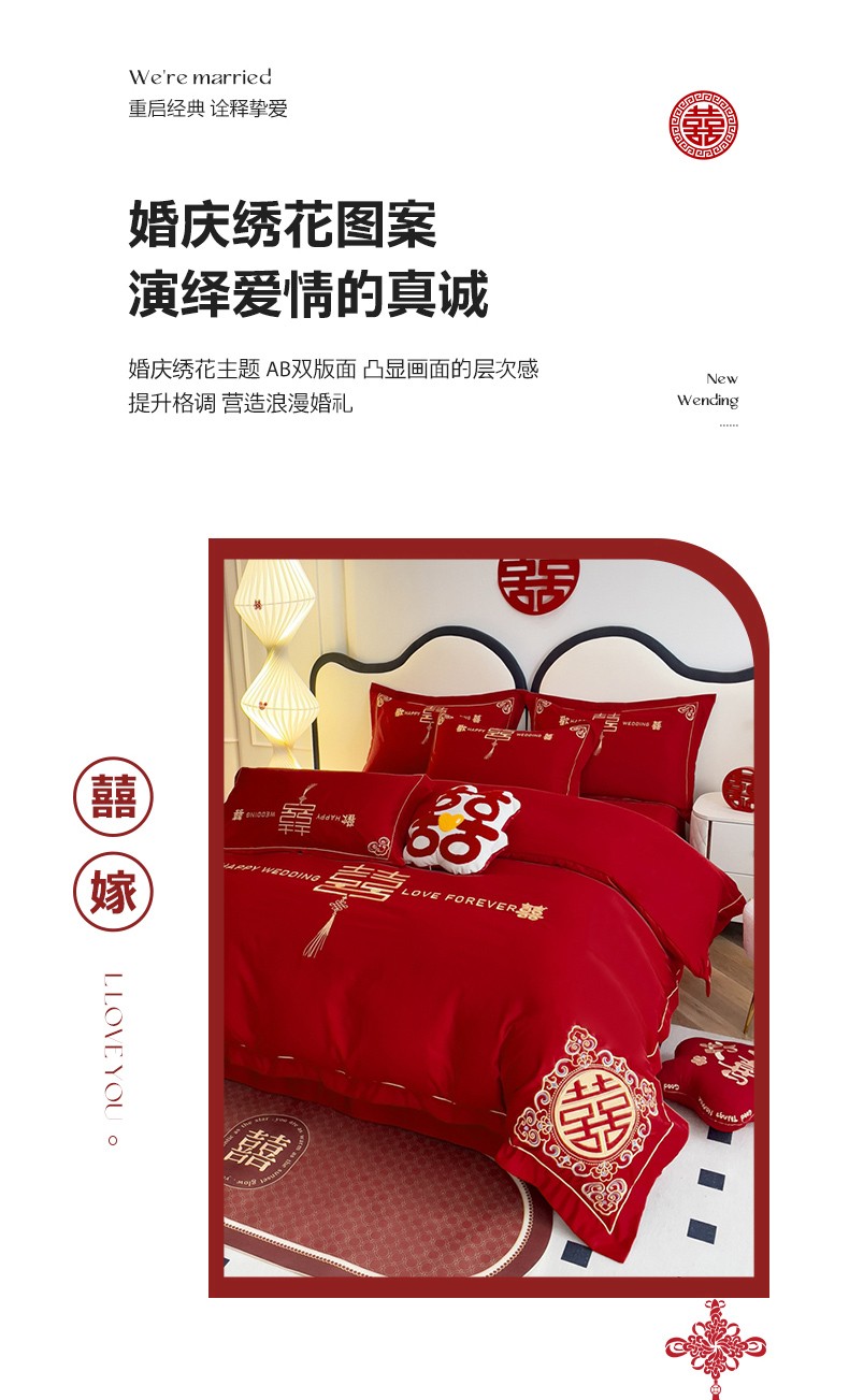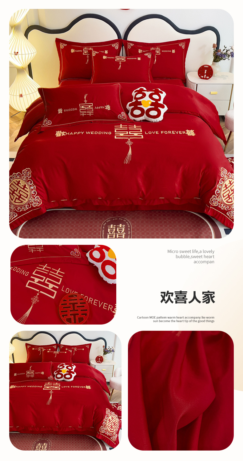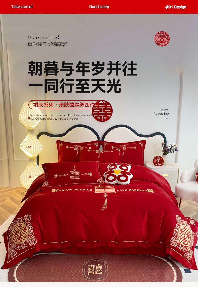 菲儿家纺 2023新款亲肤舒适臻丝绸婚庆四件套 欢喜人家