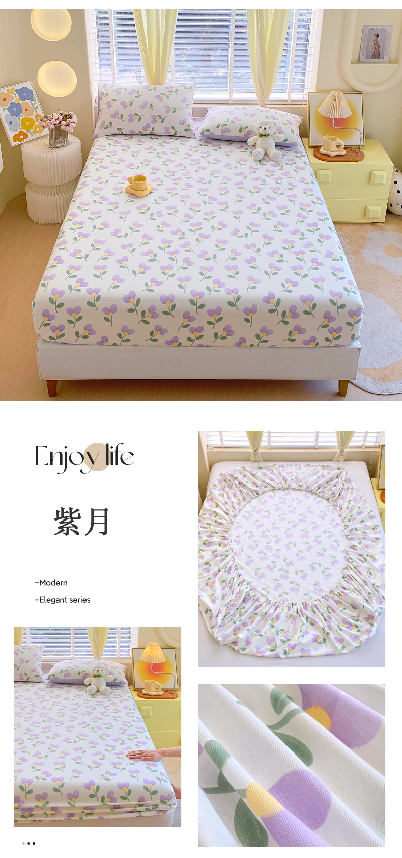 洺兰家居 2025新款全棉喷气印花单床笠纯棉小清新花卉北欧风床套/枕套 紫月