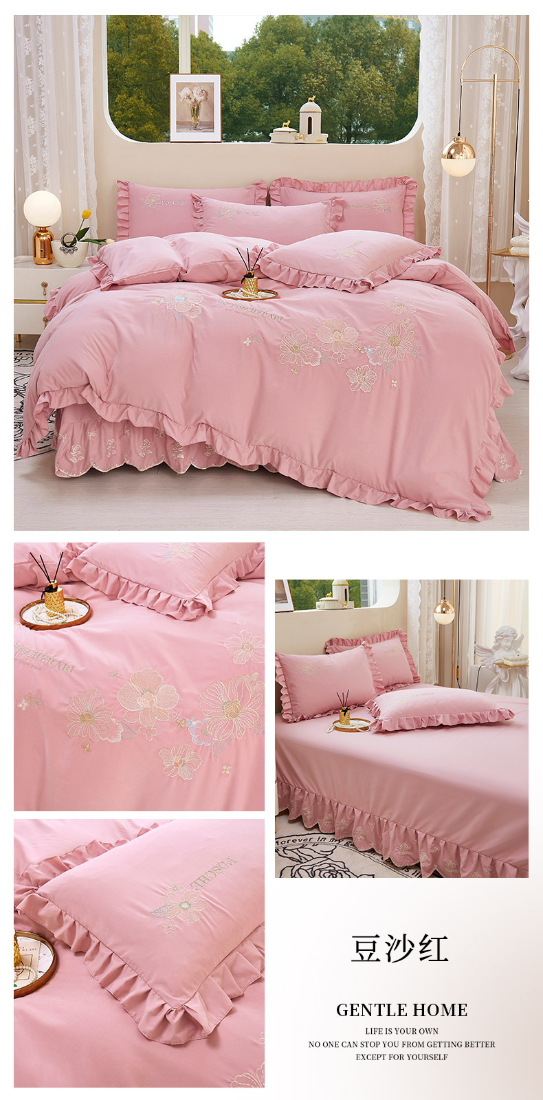 商品名称:苏木年华 2024新款春光里系列韩版荷叶边刺绣加大床单四件套 豆沙红