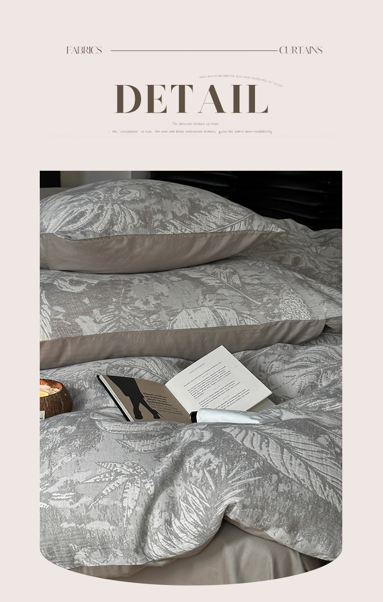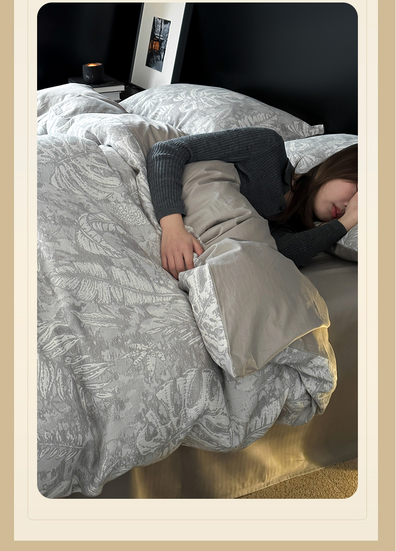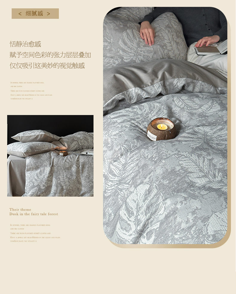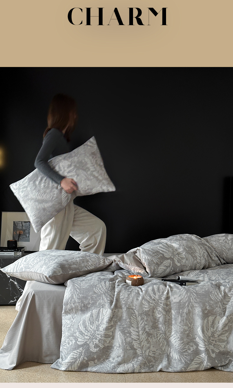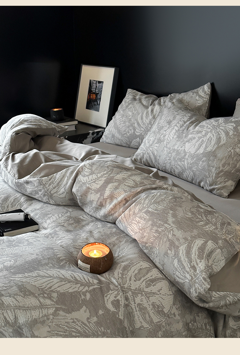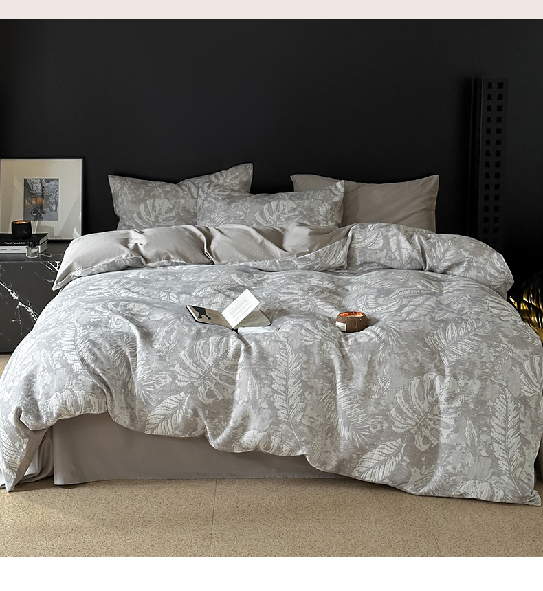 商品名称:名品优仓 全棉水洗棉三层纱提花系列四件套-蕉叶之舞 蕉叶之舞-灰