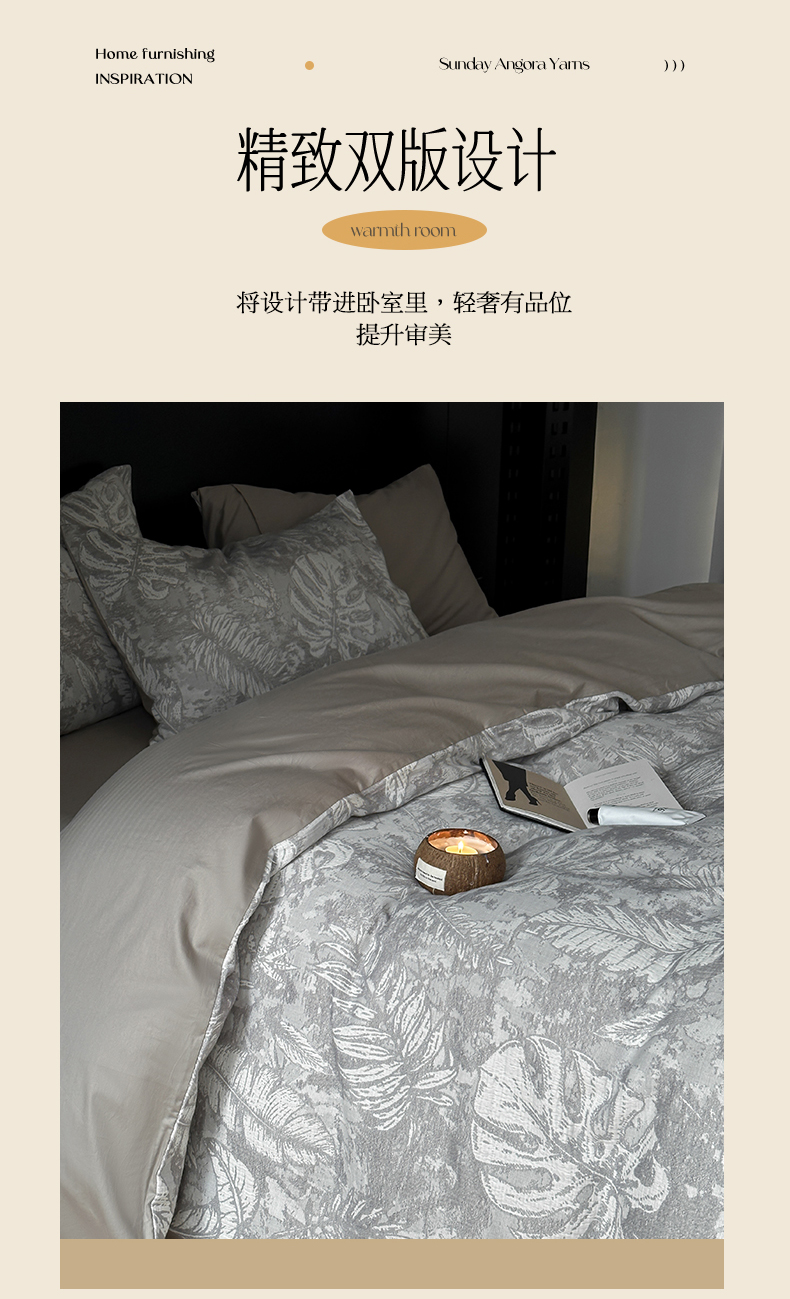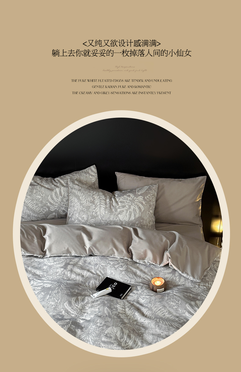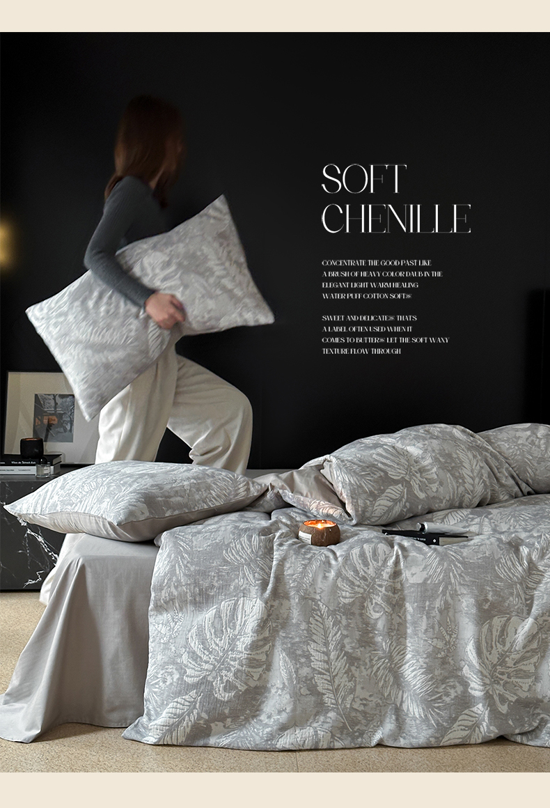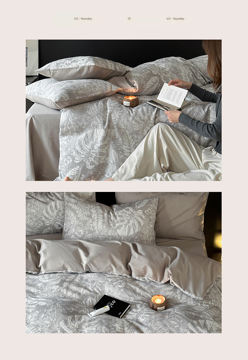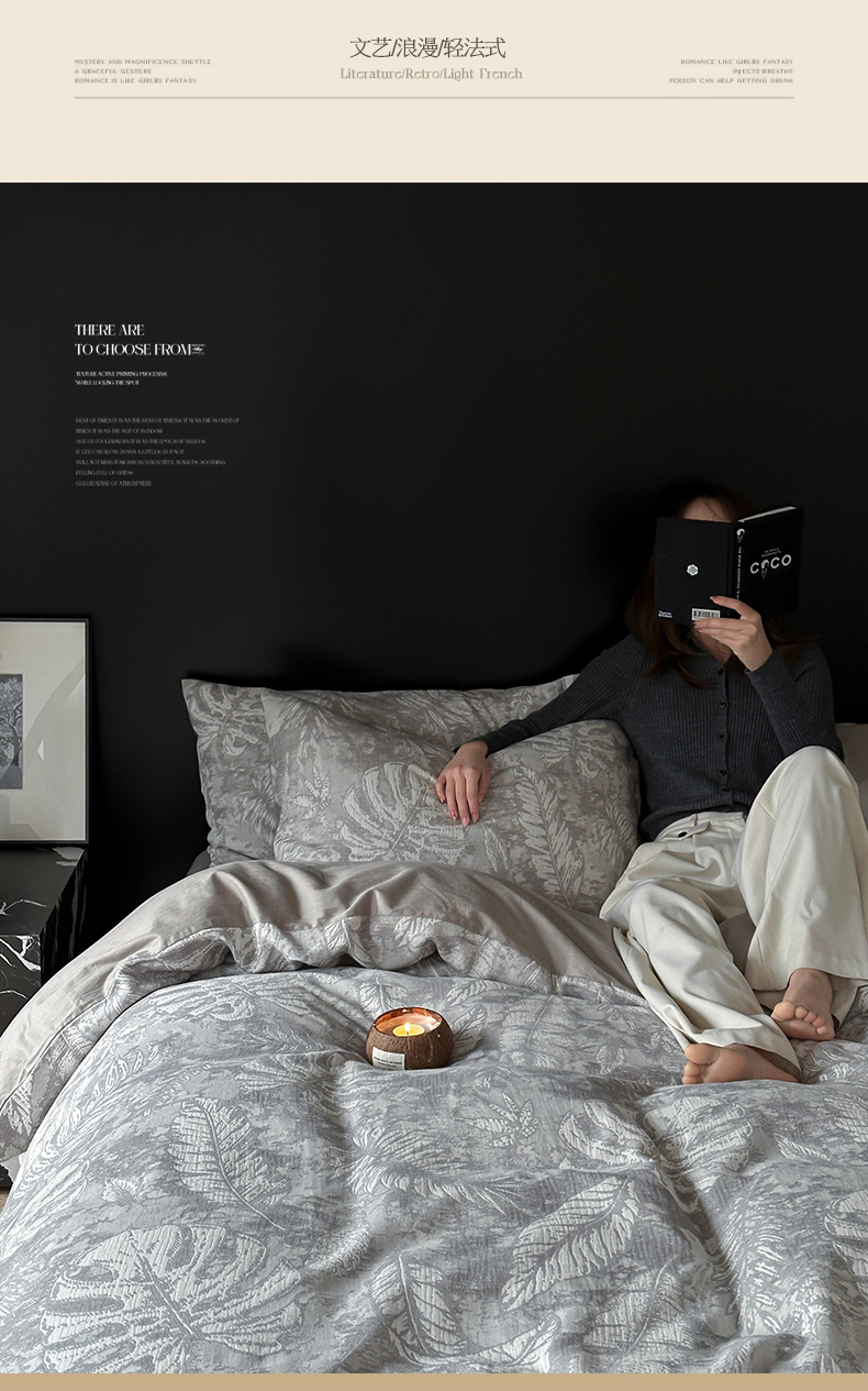 商品名称:名品优仓 全棉水洗棉三层纱提花系列四件套-蕉叶之舞 蕉叶之舞-灰