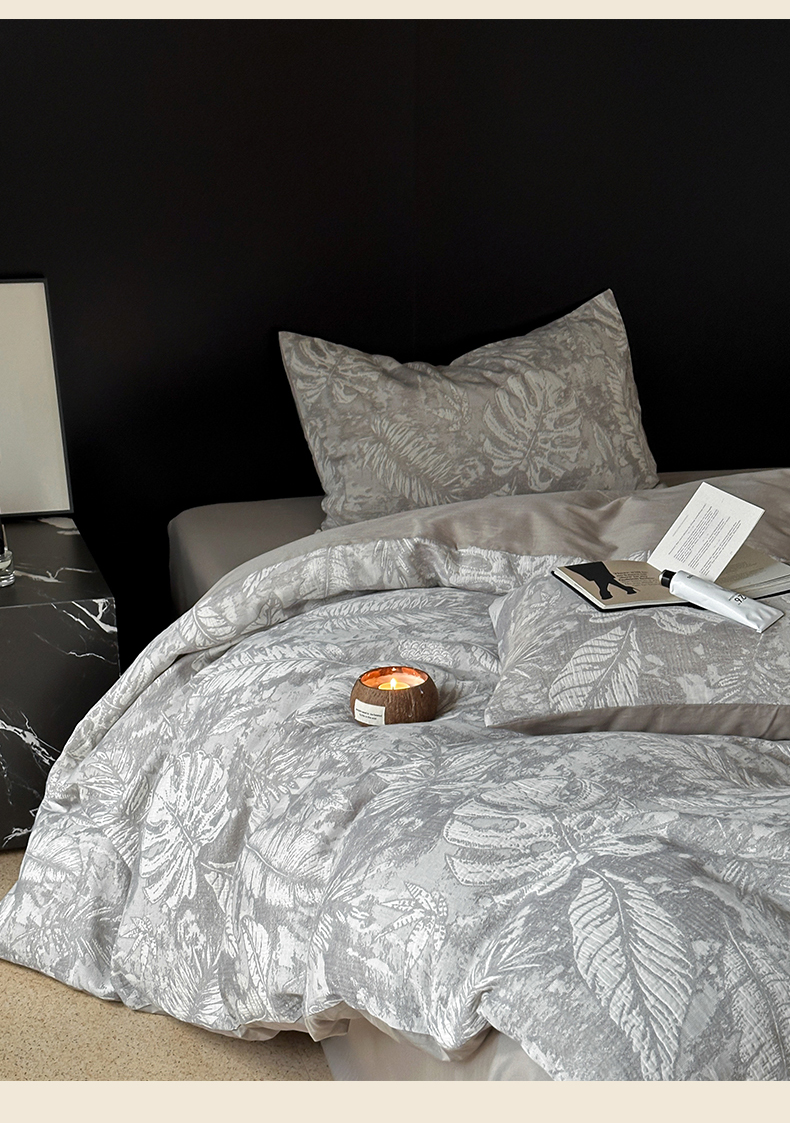 名品优仓 全棉水洗棉三层纱提花系列四件套-蕉叶之舞 蕉叶之舞-灰