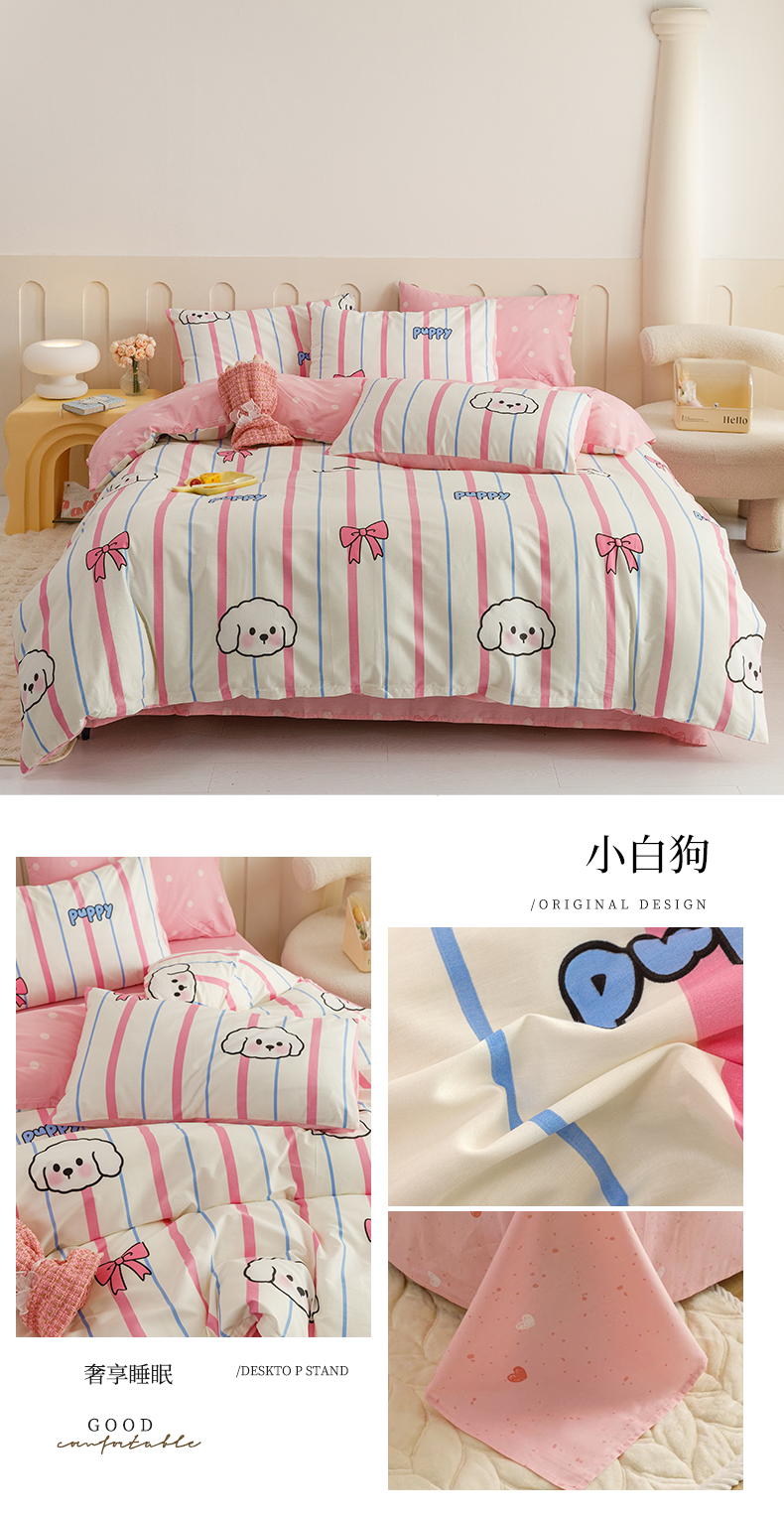 当前位置: 91家纺网 > 商品网购 > 床品套件 > 四件套 > 全棉普通四件套 > 红粉佳人家纺 2024新款纯棉卡通小清新四件套及单品 小白狗