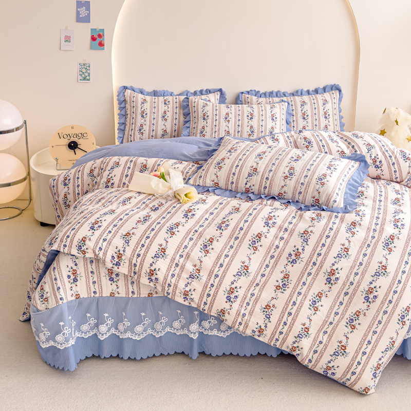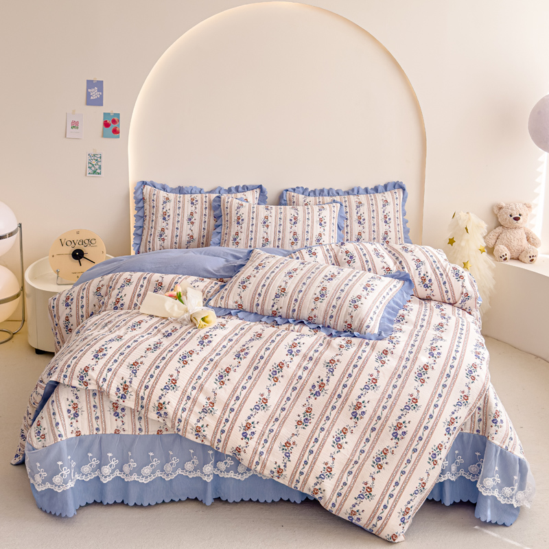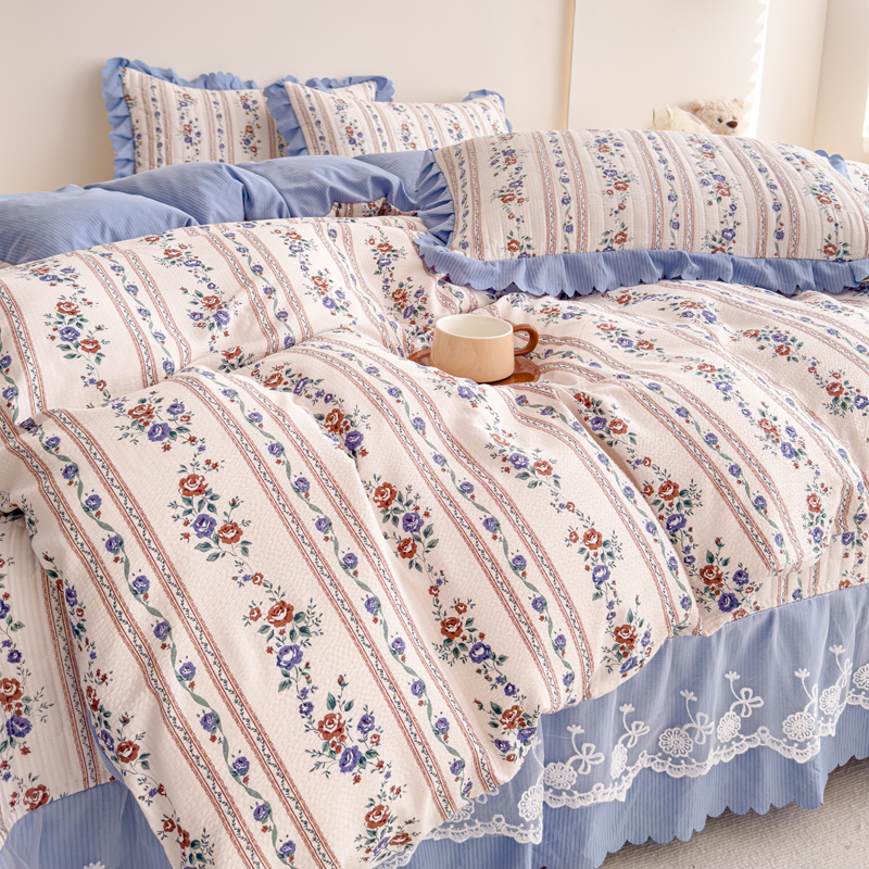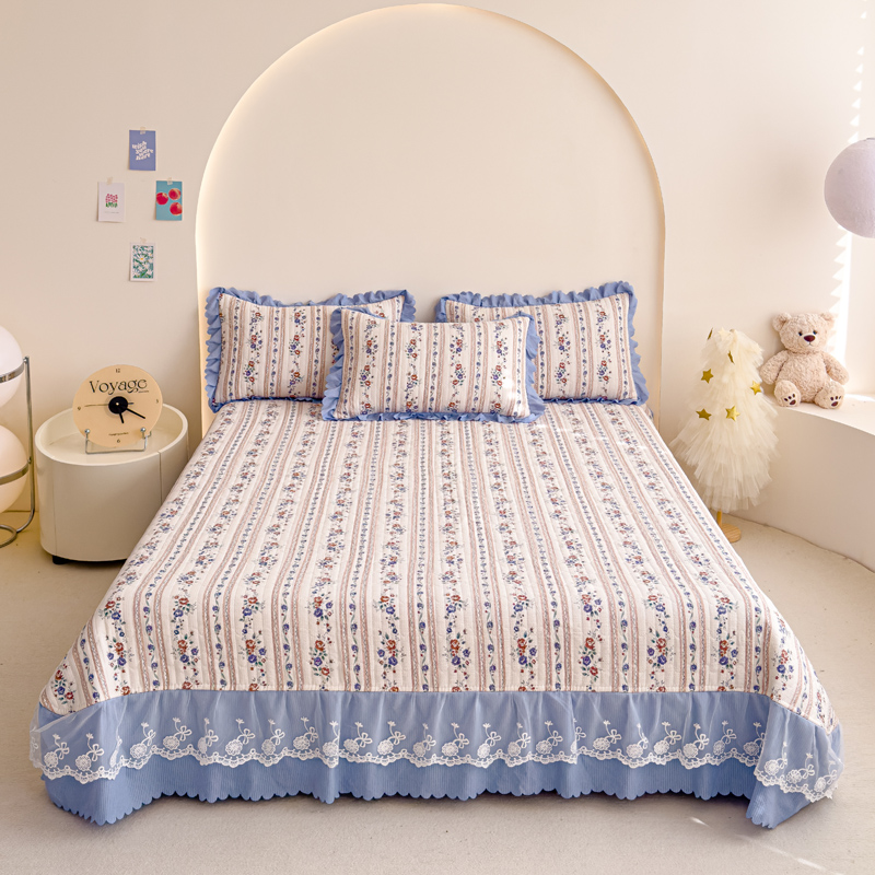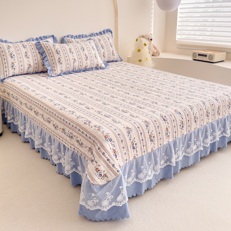 2024直播爆款泡泡棉床盖款四件套双层蕾丝花边夹棉床裙款三件套 可可庄园