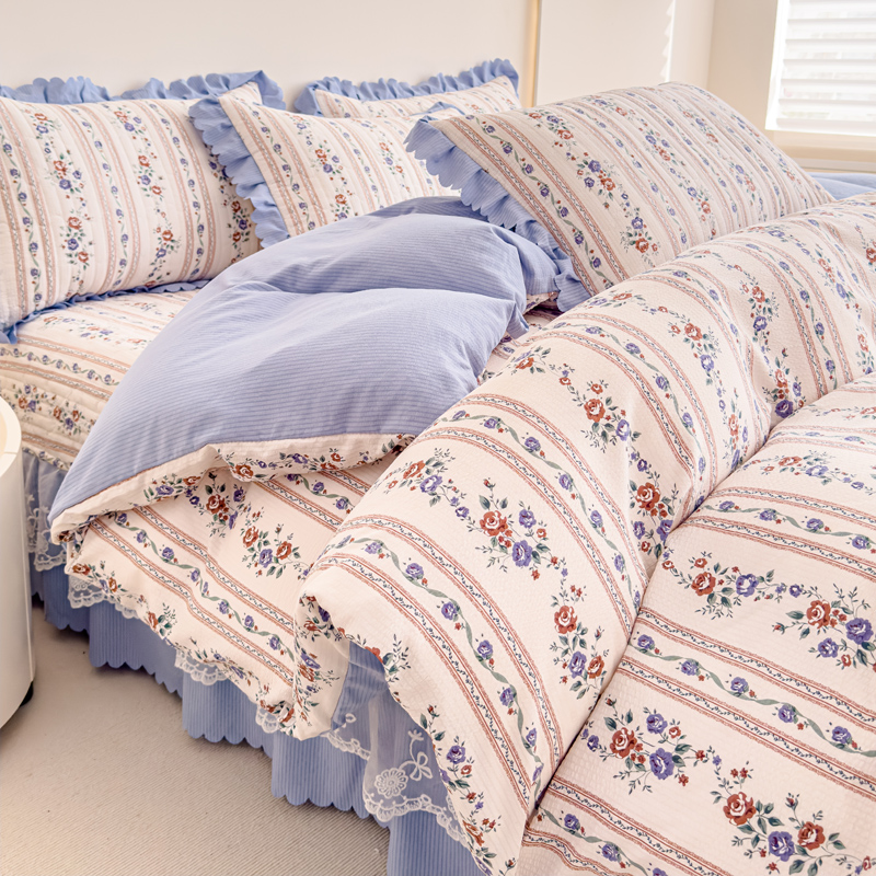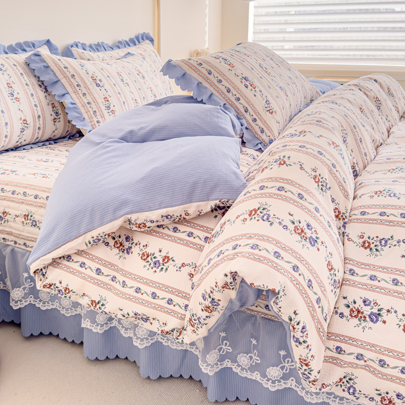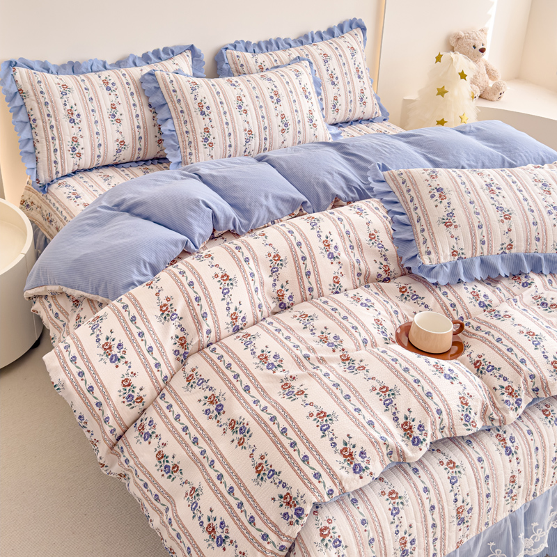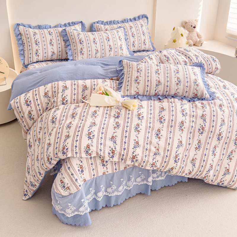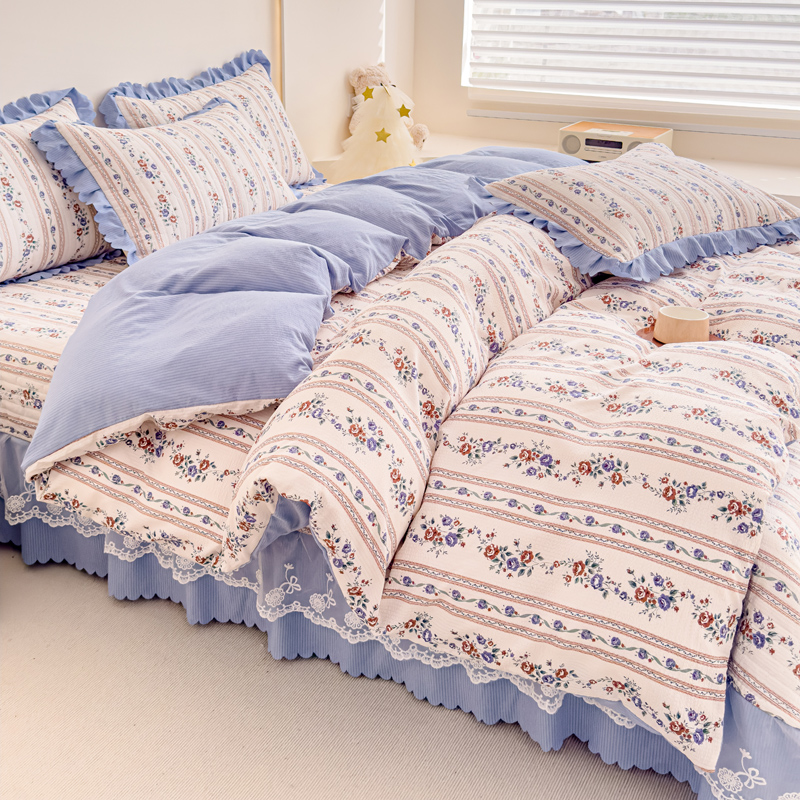 2024直播爆款泡泡棉床盖款四件套双层蕾丝花边夹棉床裙款三件套 可可庄园