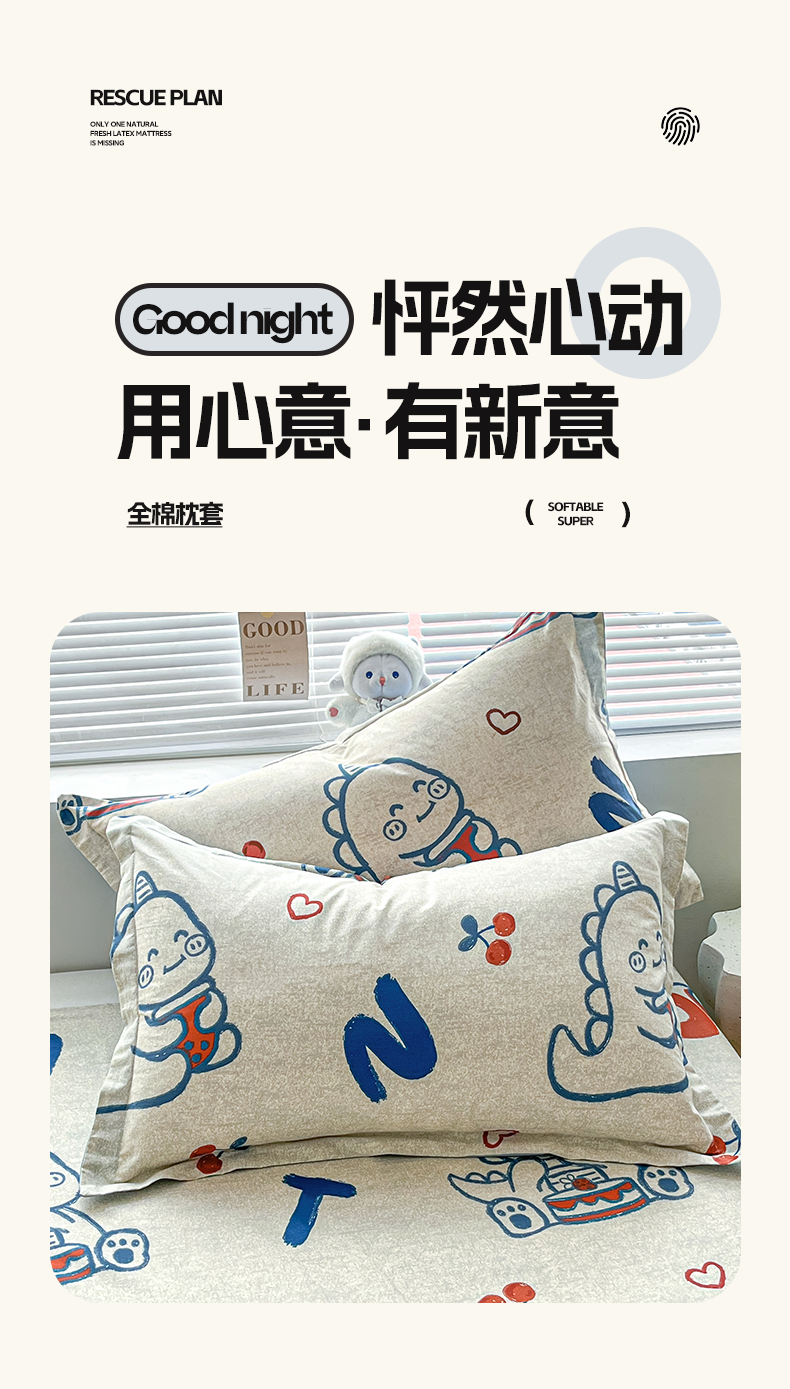 涵宸家纺 2024新款全棉小清新印花单品套件--单枕套 枕套-皮皮龙