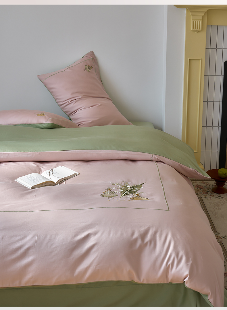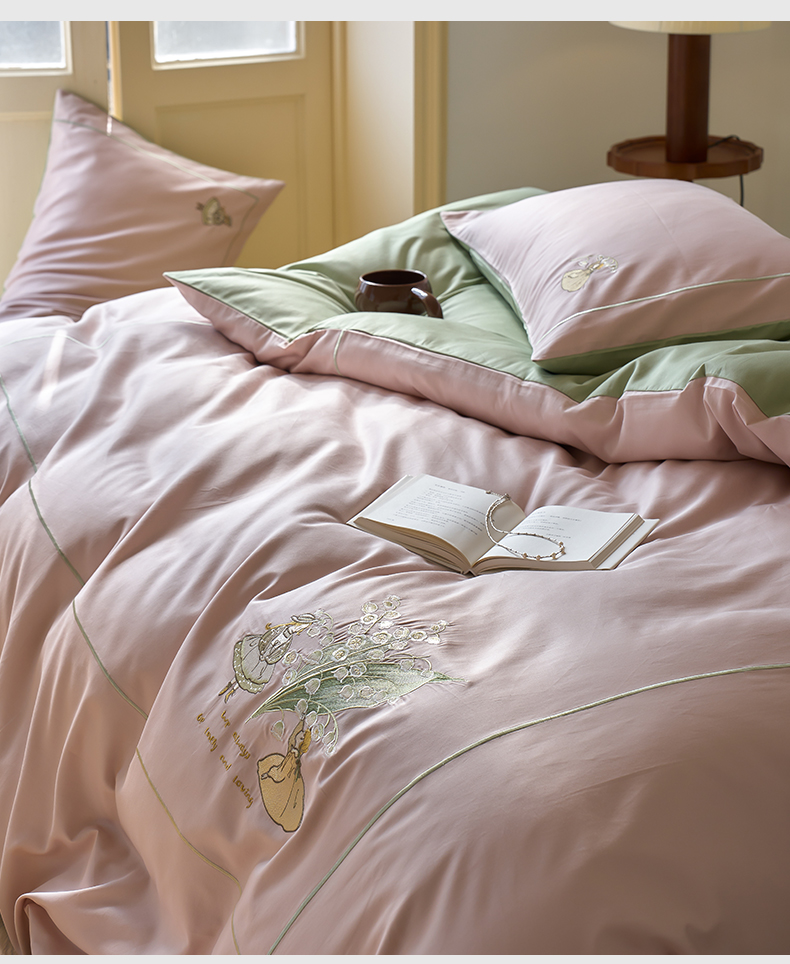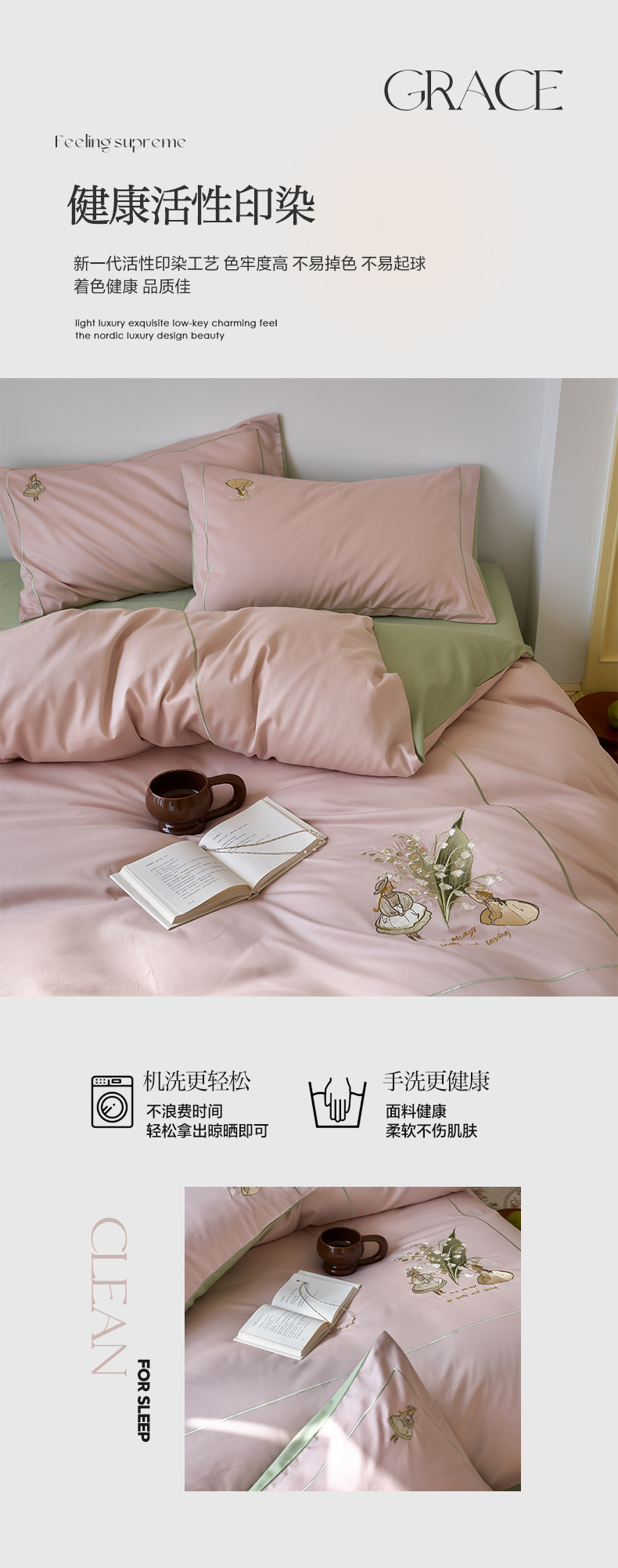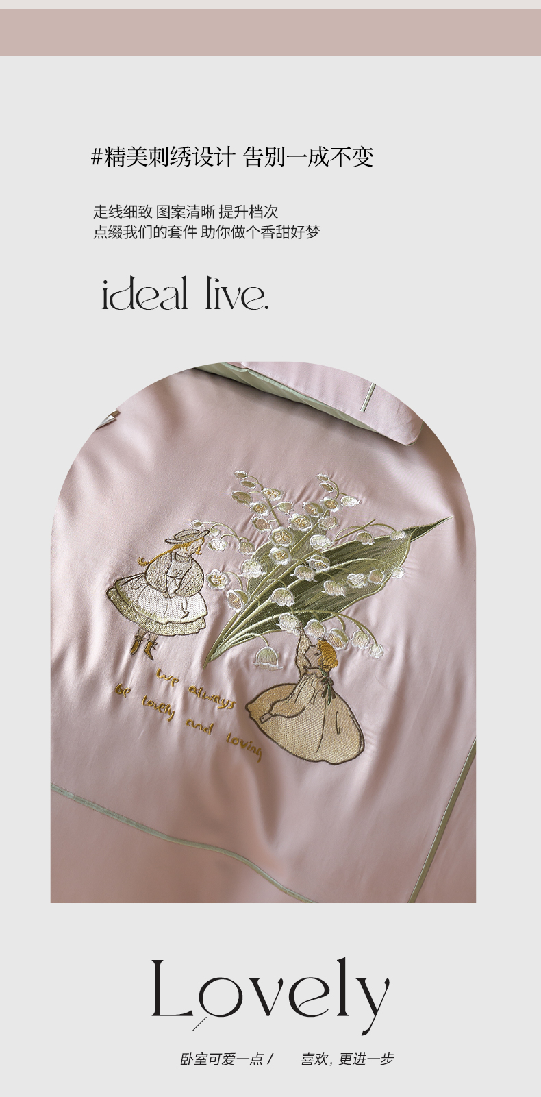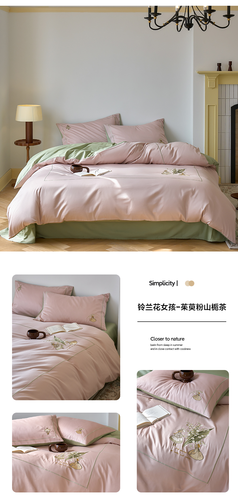商品名称:秀色家纺 2025新款ins风春季纯棉床上四件套高级感透气全棉网红床品被套床单三件套-绣花小女孩 铃兰花女孩-茱萸粉山栀茶