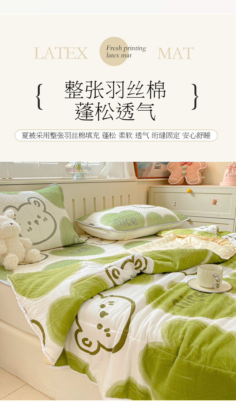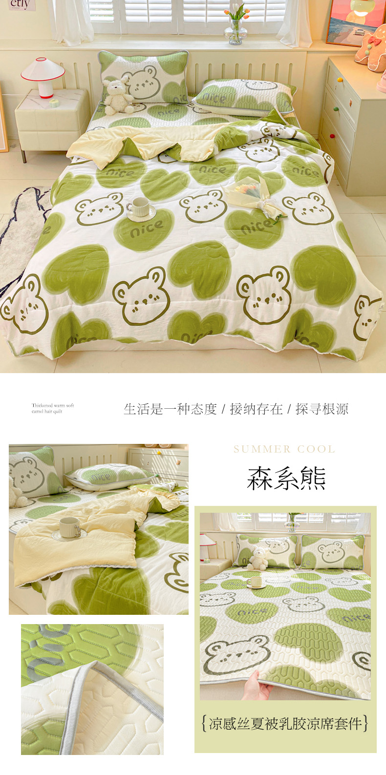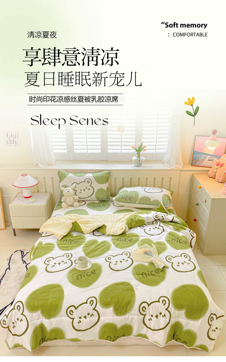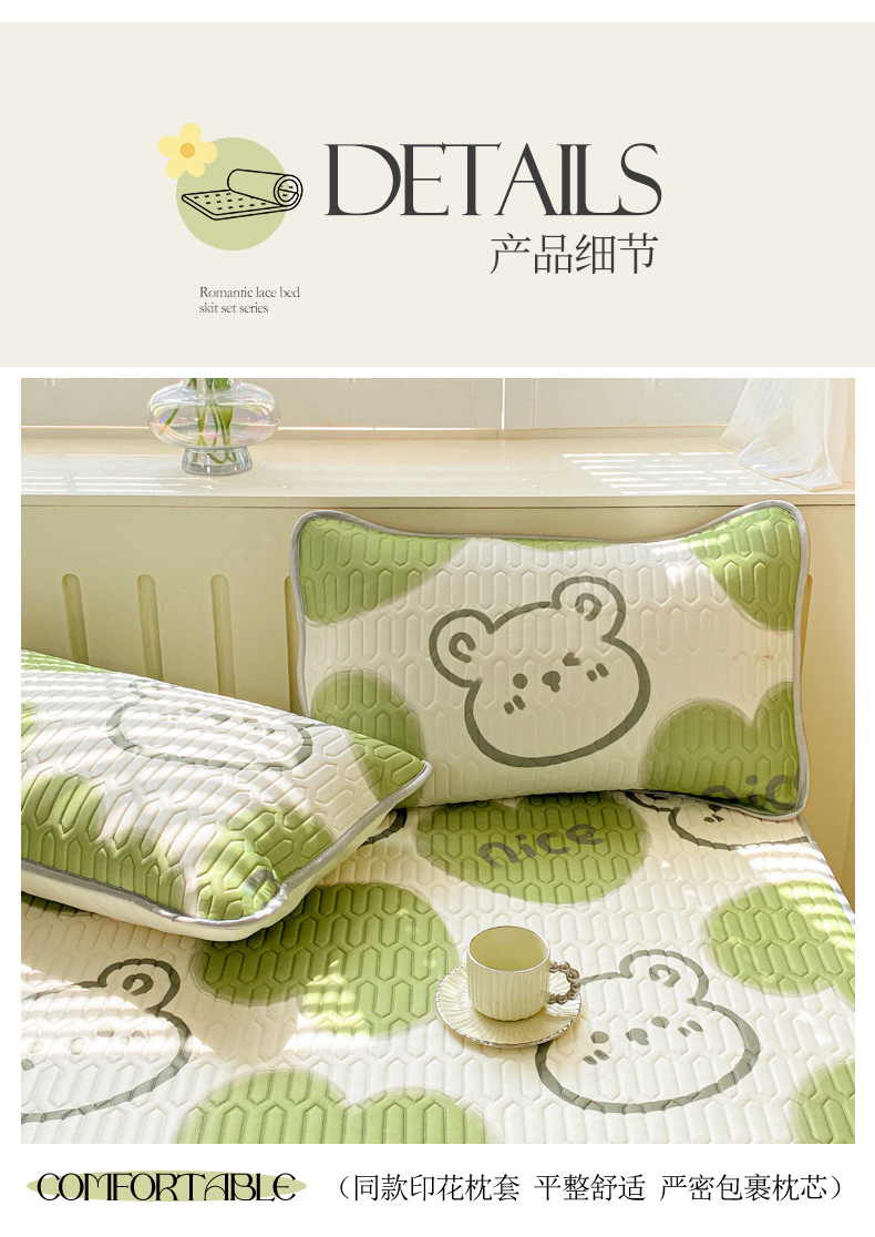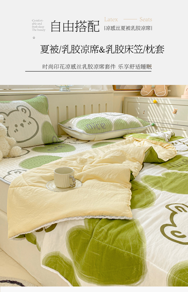 当前位置: 91家纺网 > 商品网购 > 床品套件 > 四件套 > 夏被四件套 > 寐居家纺 2024新款时尚印花凉感丝乳胶凉席小花边夏被四件套系列 森系熊