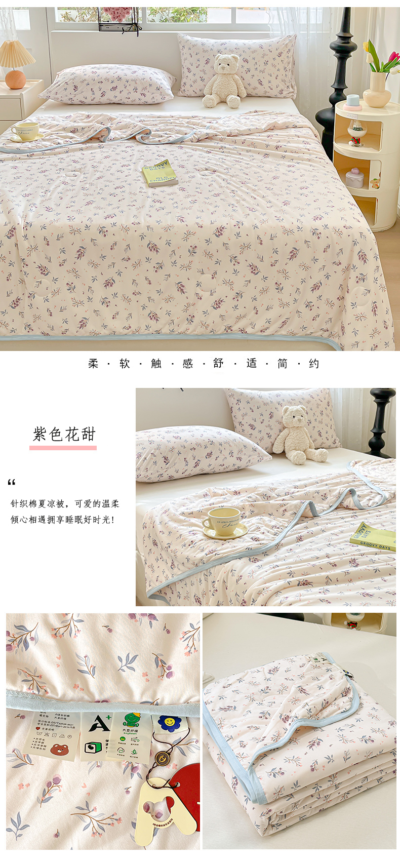 商品名称:葡萄家 2024新款A类母婴级大豆纤维牛奶丝针织棉夏凉被 紫色花甜