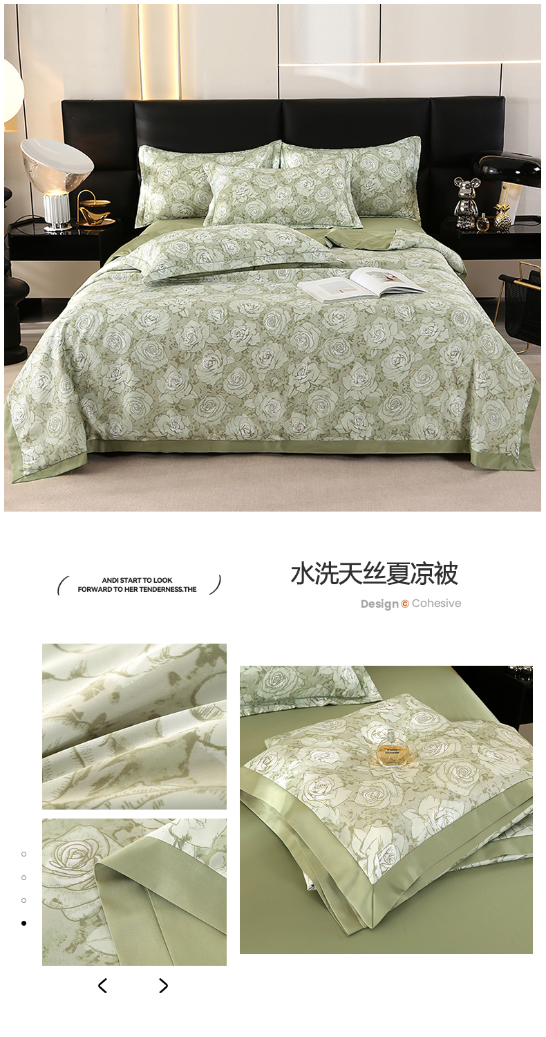 商品名称:富之航家纺 2024新款拼角宽边水洗天丝夏被四件套 玫瑰绿