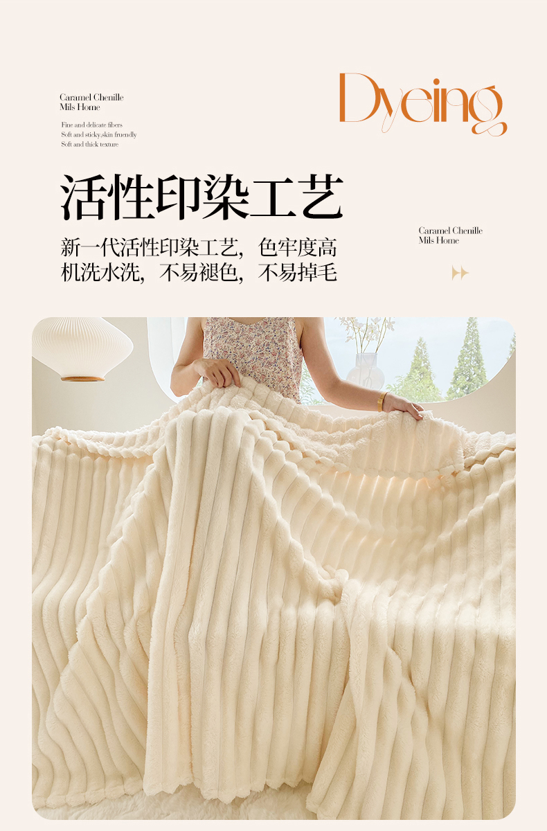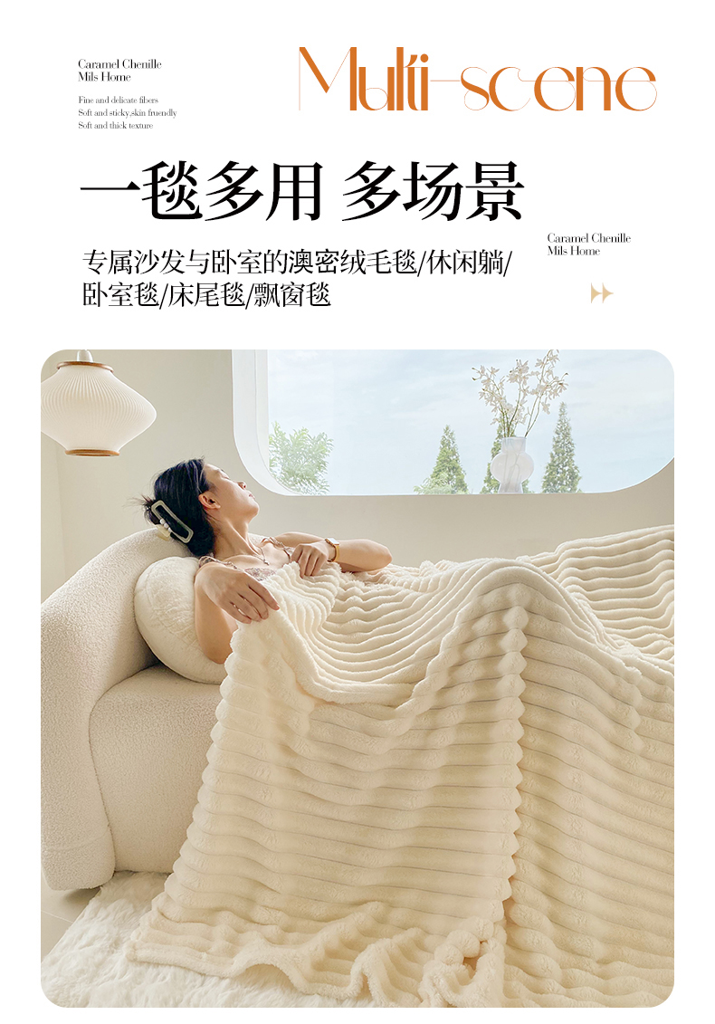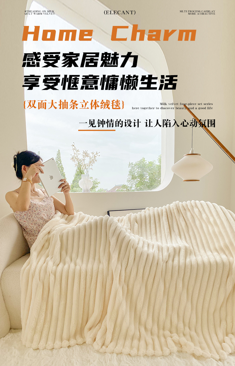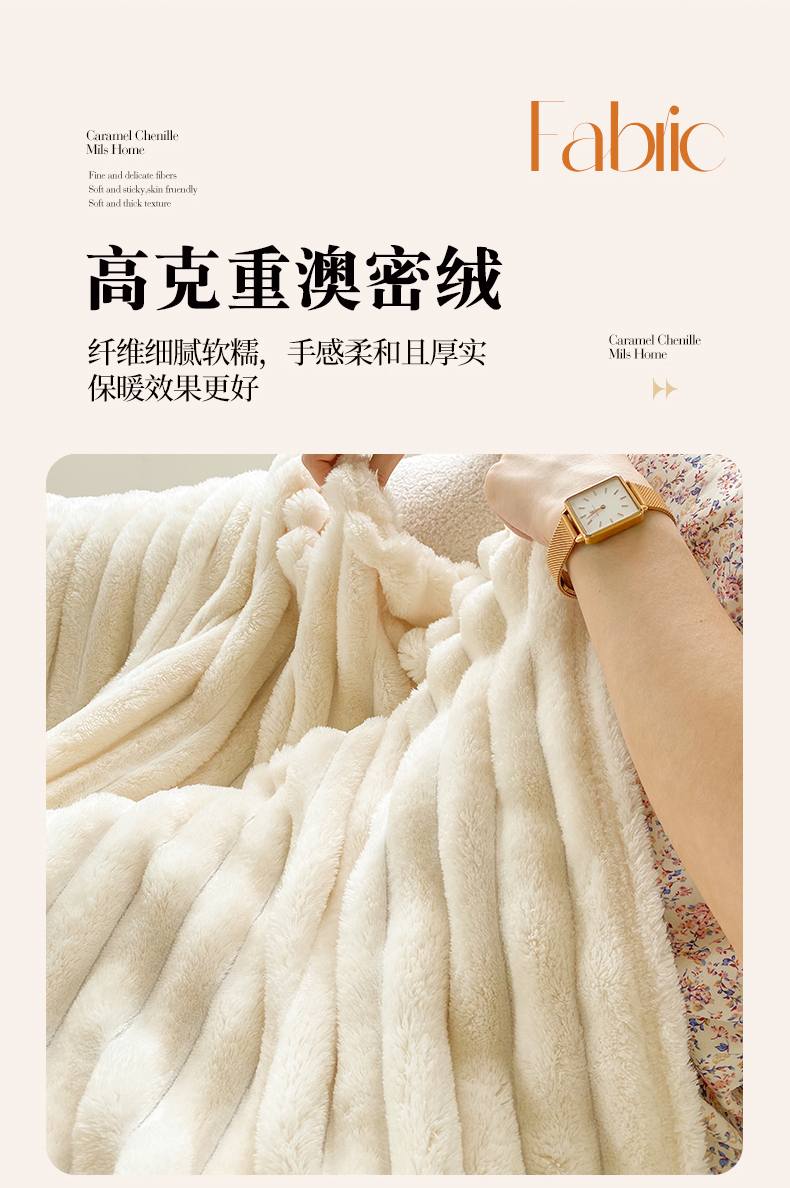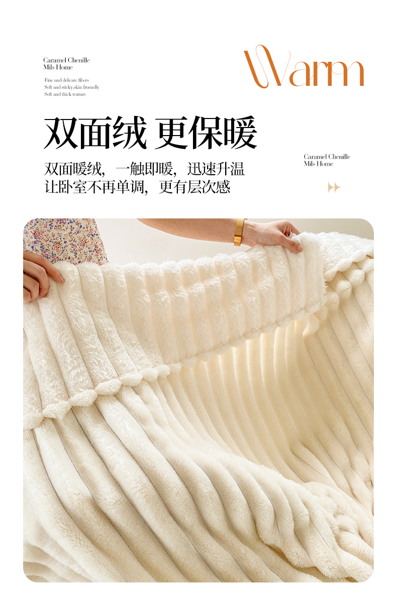 潮邦创意家居 2025新款双面340G 4.5公分大抽条立体绒毯毛毯盖毯可供跨境电商可压缩 宽条奶油白