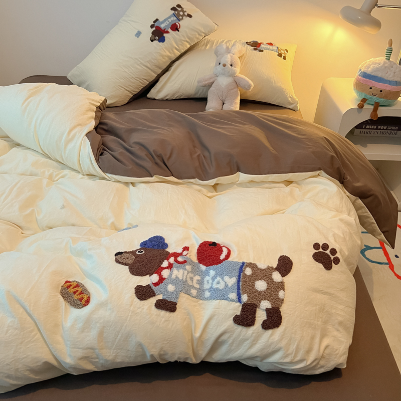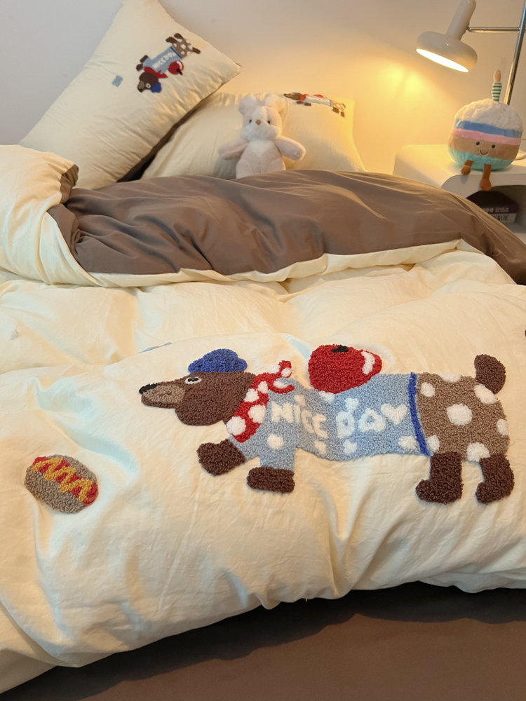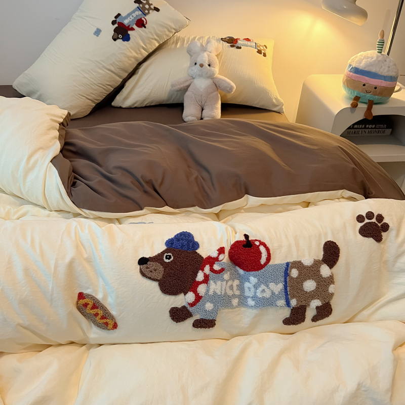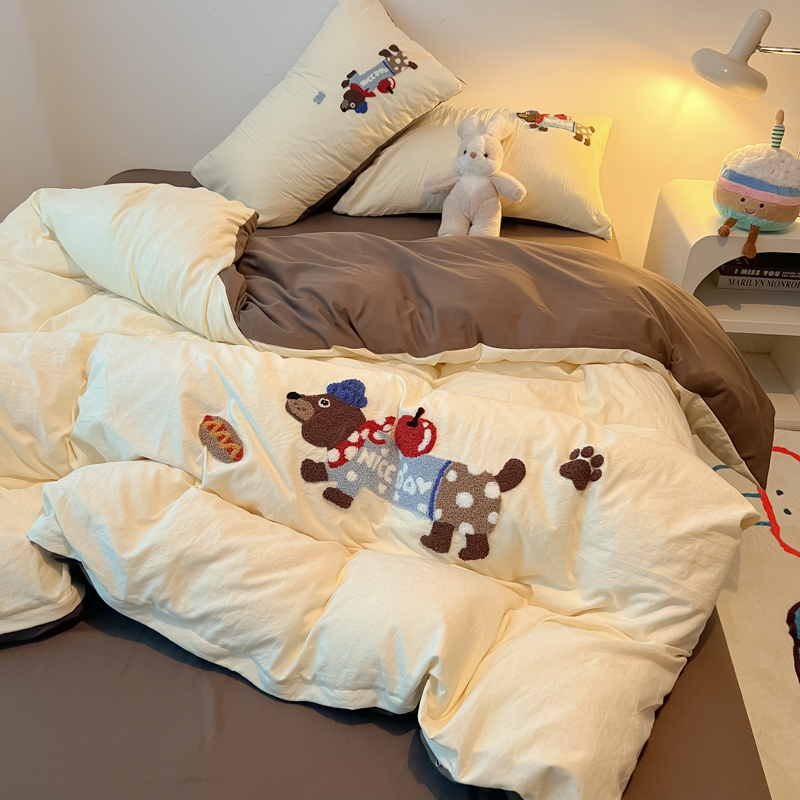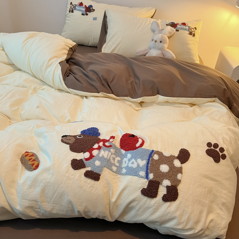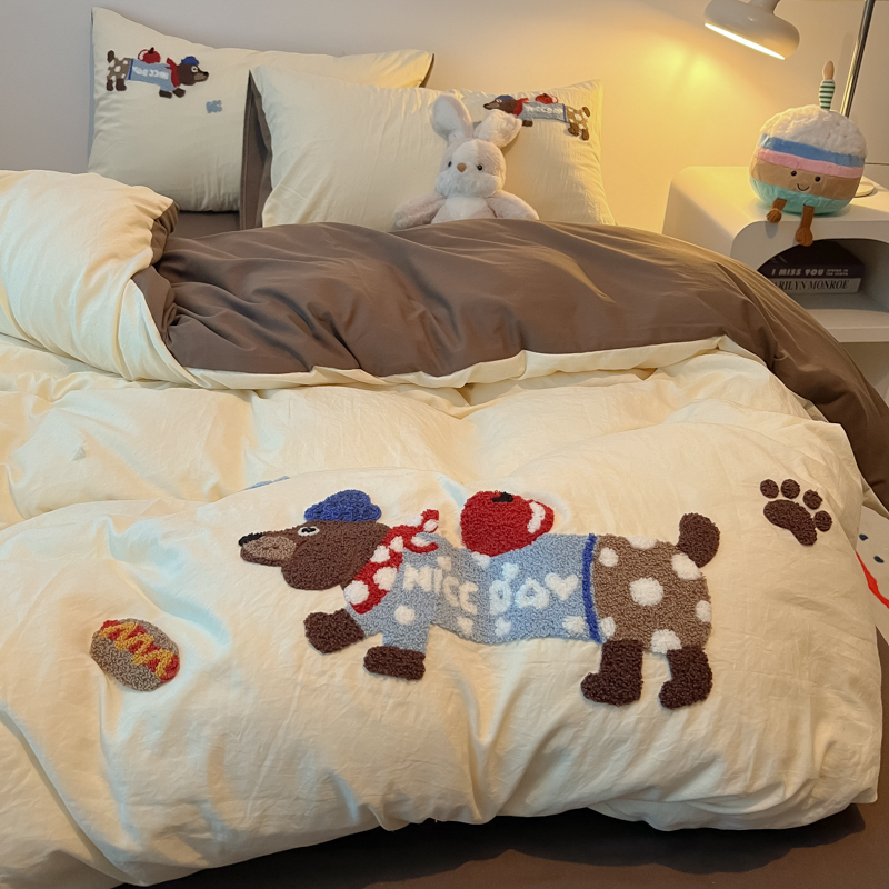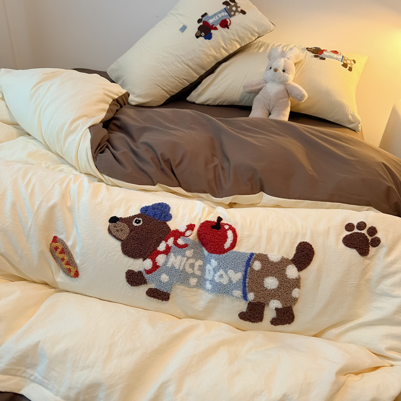 盼季家纺 2024年新款大版可爱毛巾绣超柔水洗棉床上用品四件套 美拉德腊肠狗
