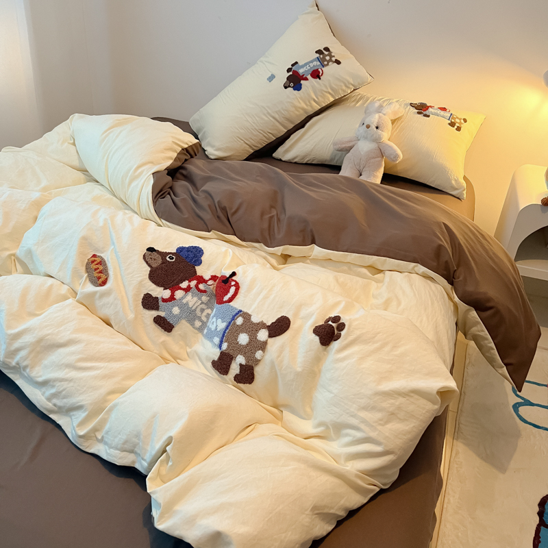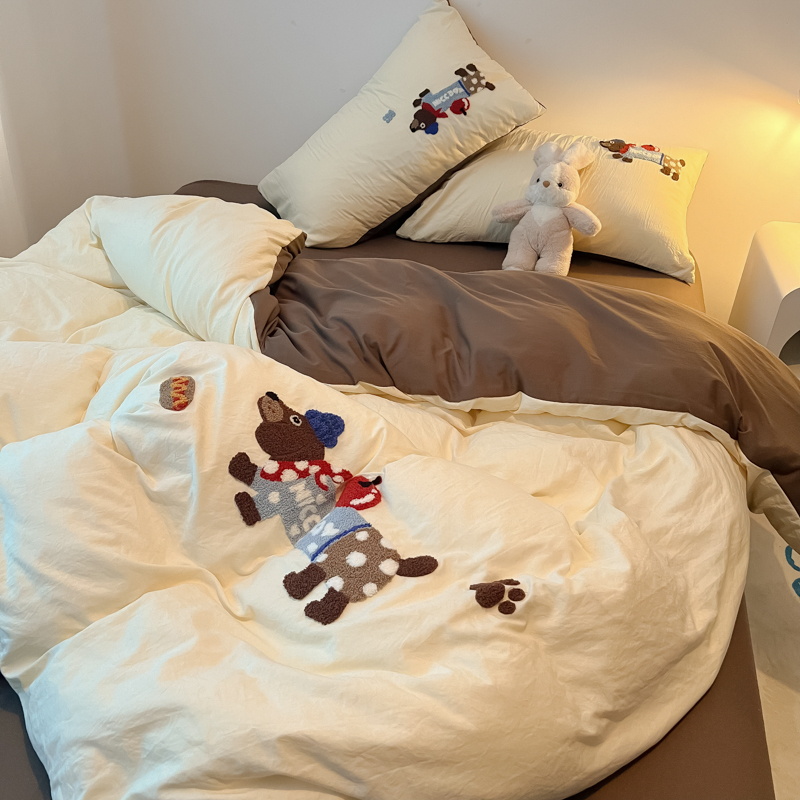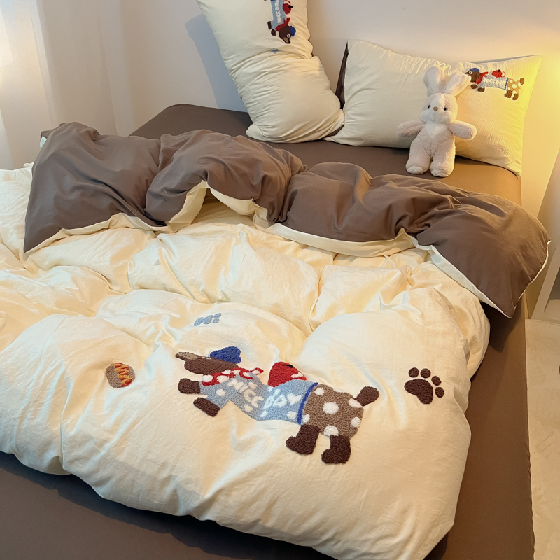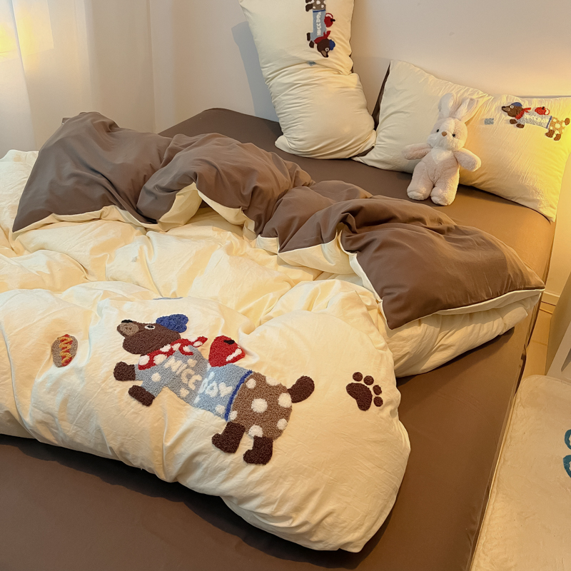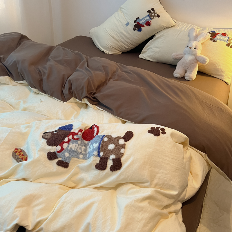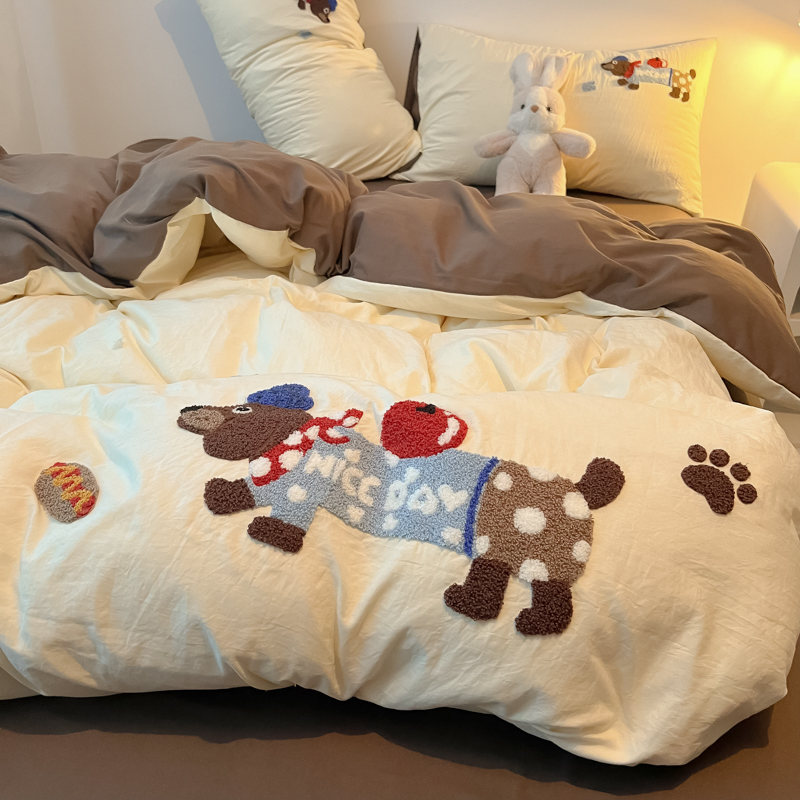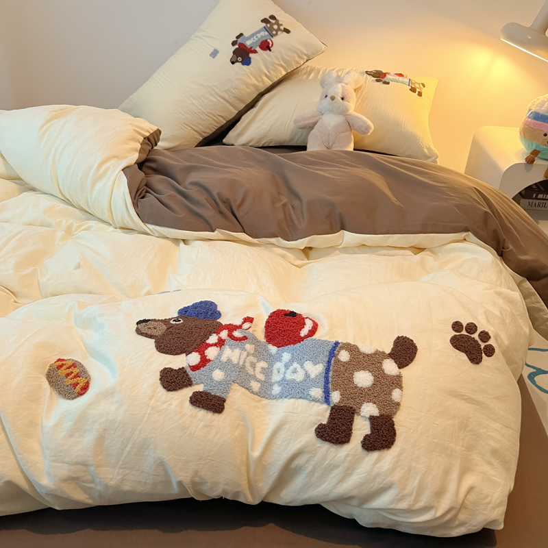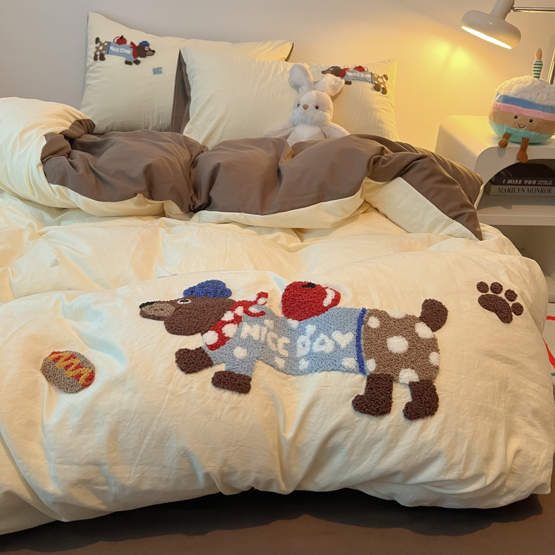 盼季家纺 2024年新款大版可爱毛巾绣超柔水洗棉床上用品四件套 美拉德腊肠狗