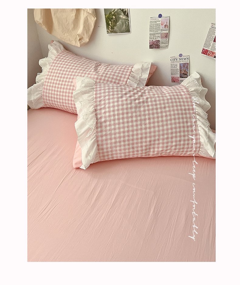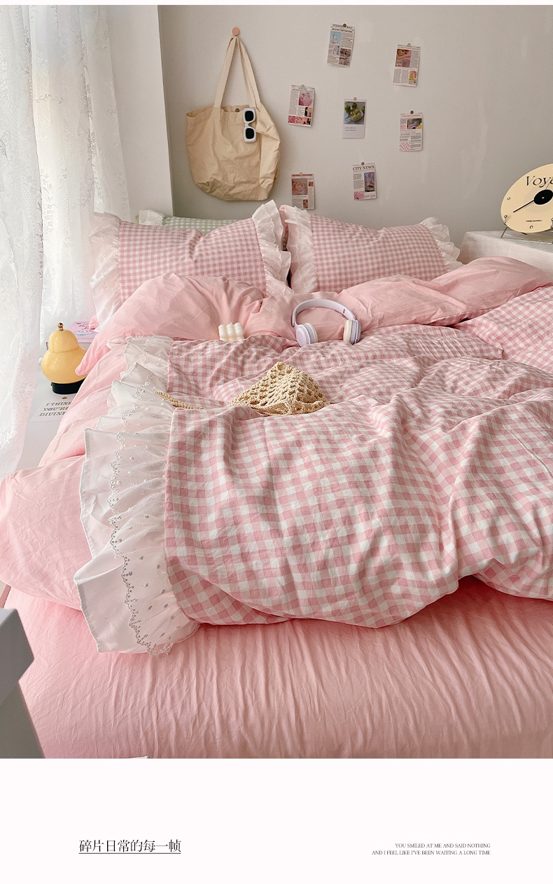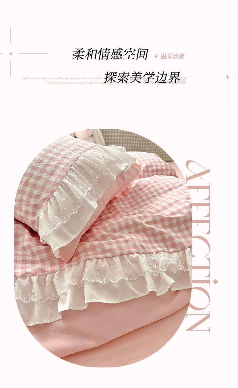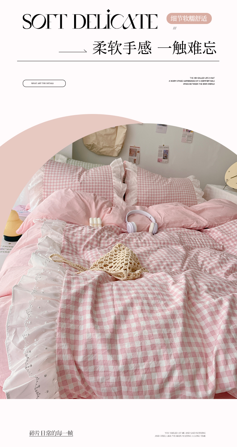 商品名称:山茶 2024新款格子水洗棉花边款四件套 格子粉