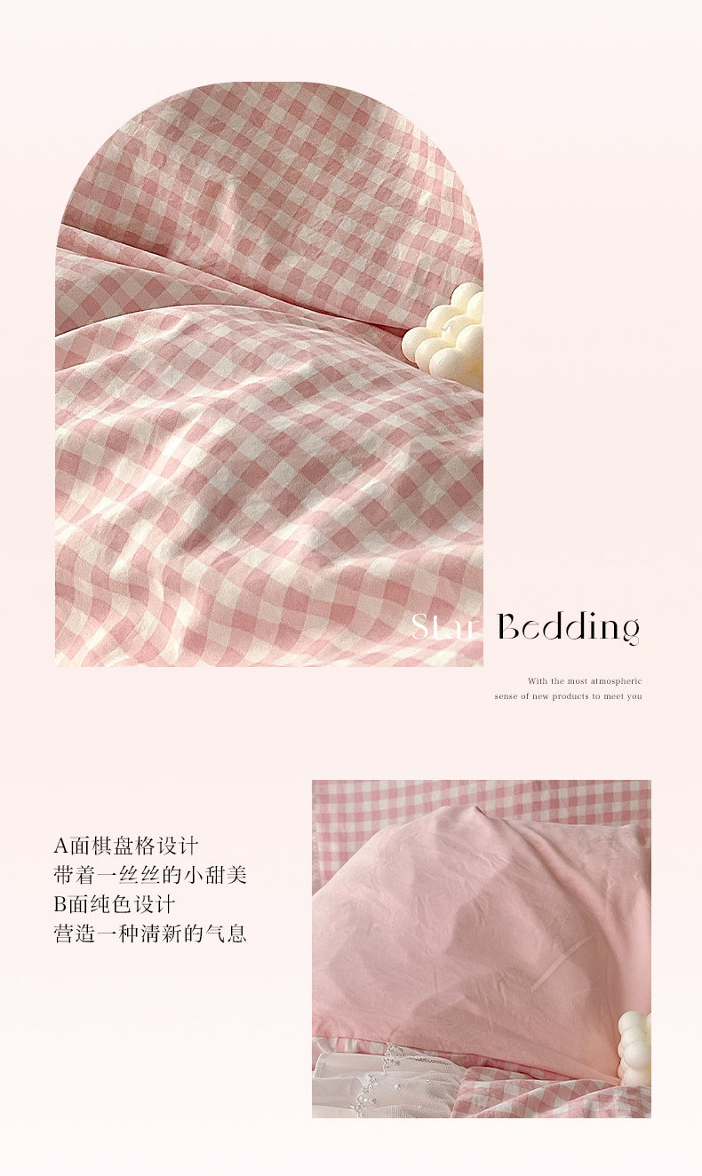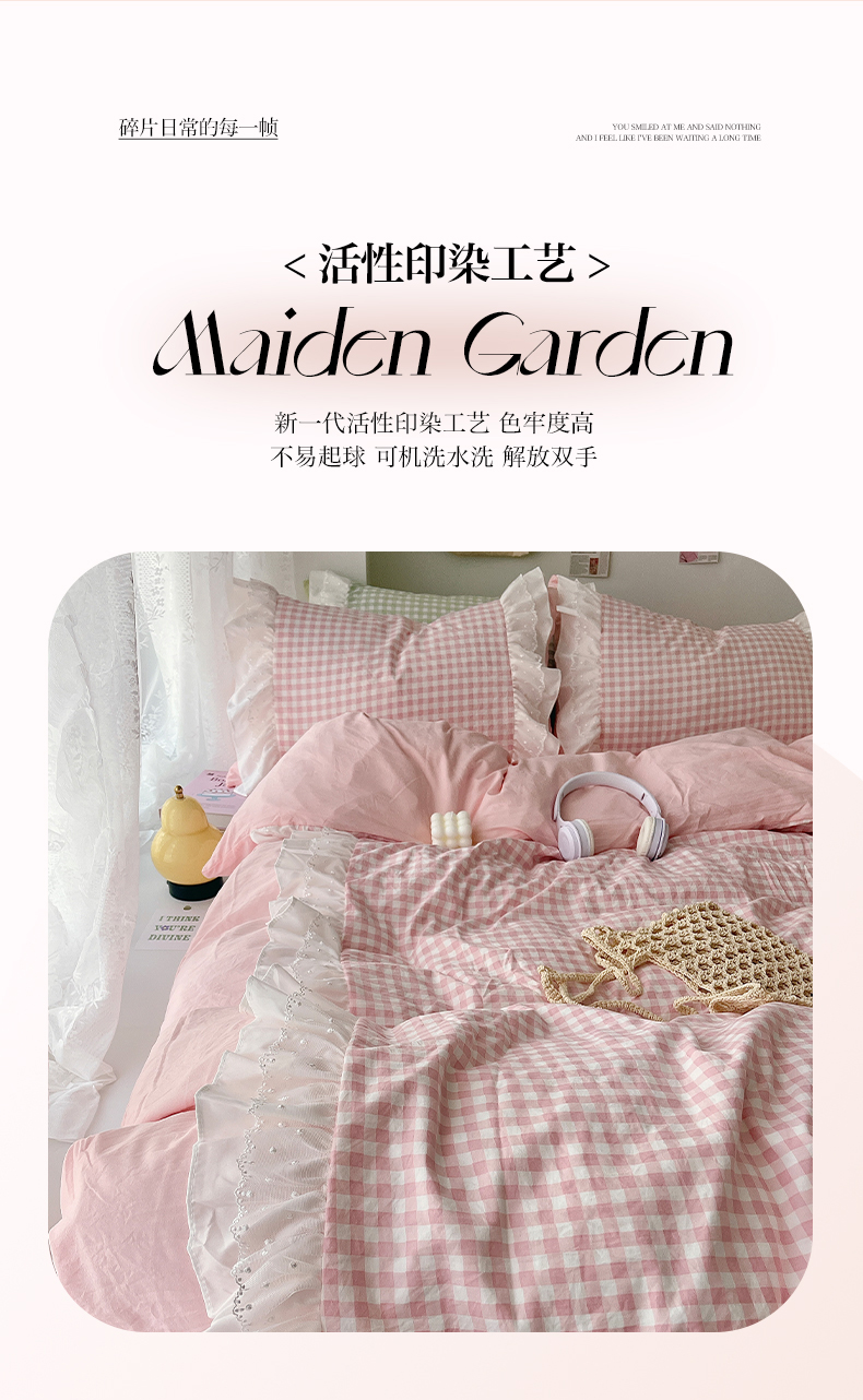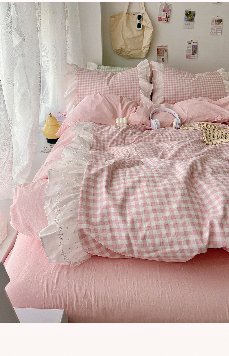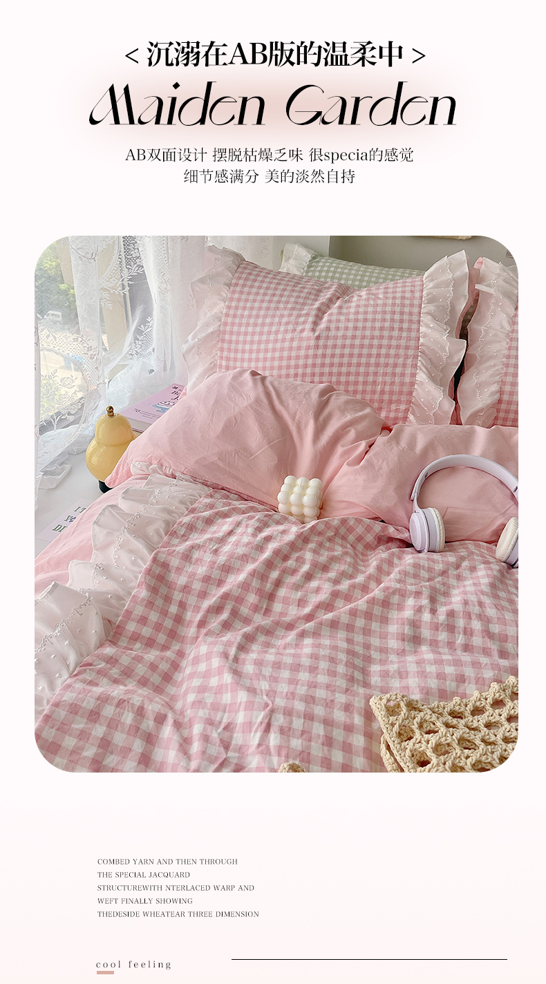 商品名称:山茶 2024新款格子水洗棉花边款四件套 格子粉
