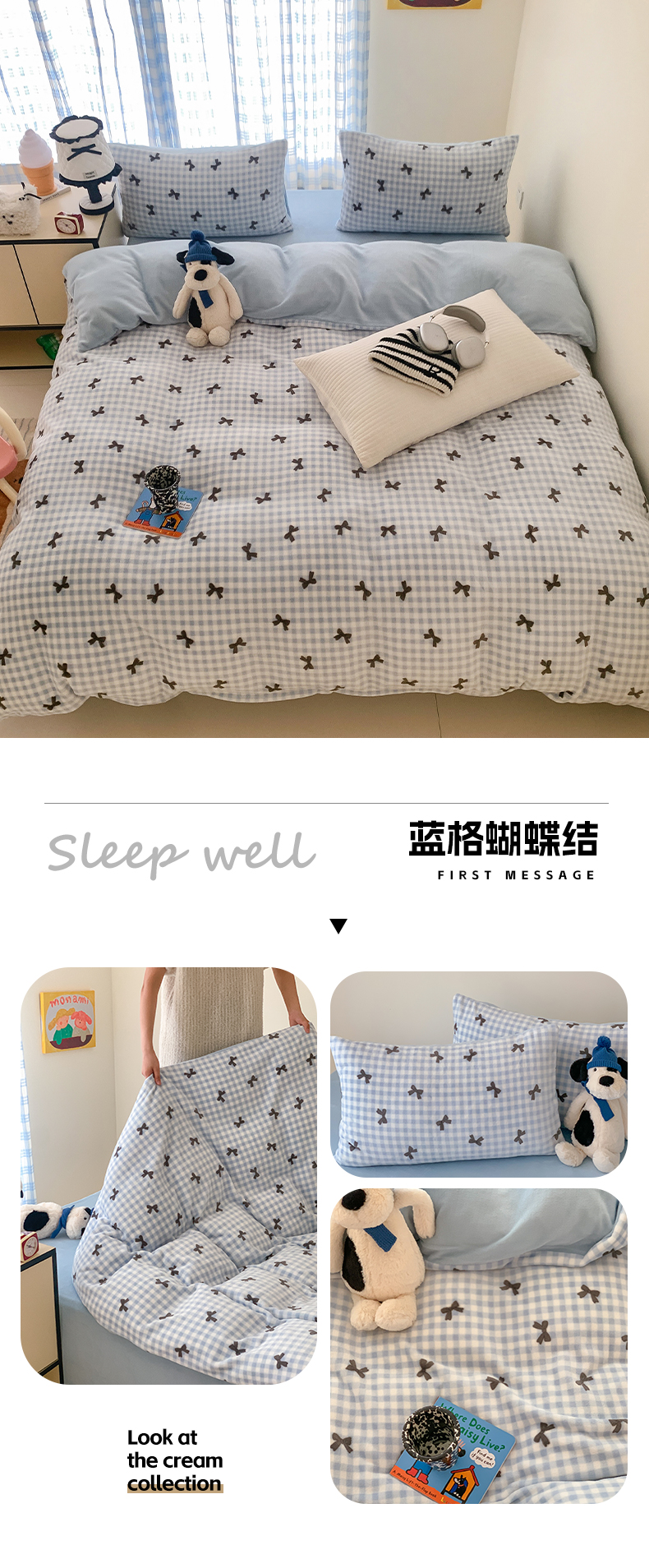 商品名称:美乐迪家纺 2024新款高品质牛奶绒四件套 蓝格蝴蝶结