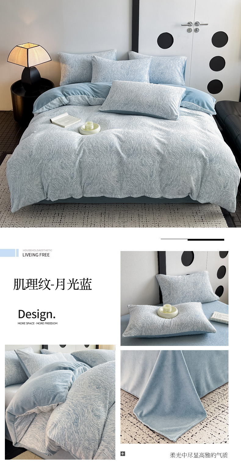 商品名称:2024新款A类双色立体浮雕牛奶绒加厚四件套 肌理纹-月光蓝