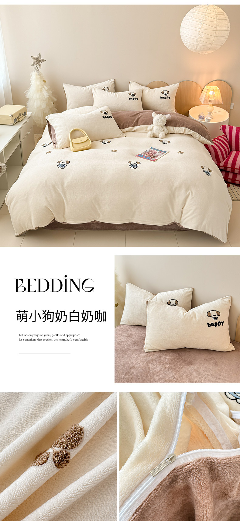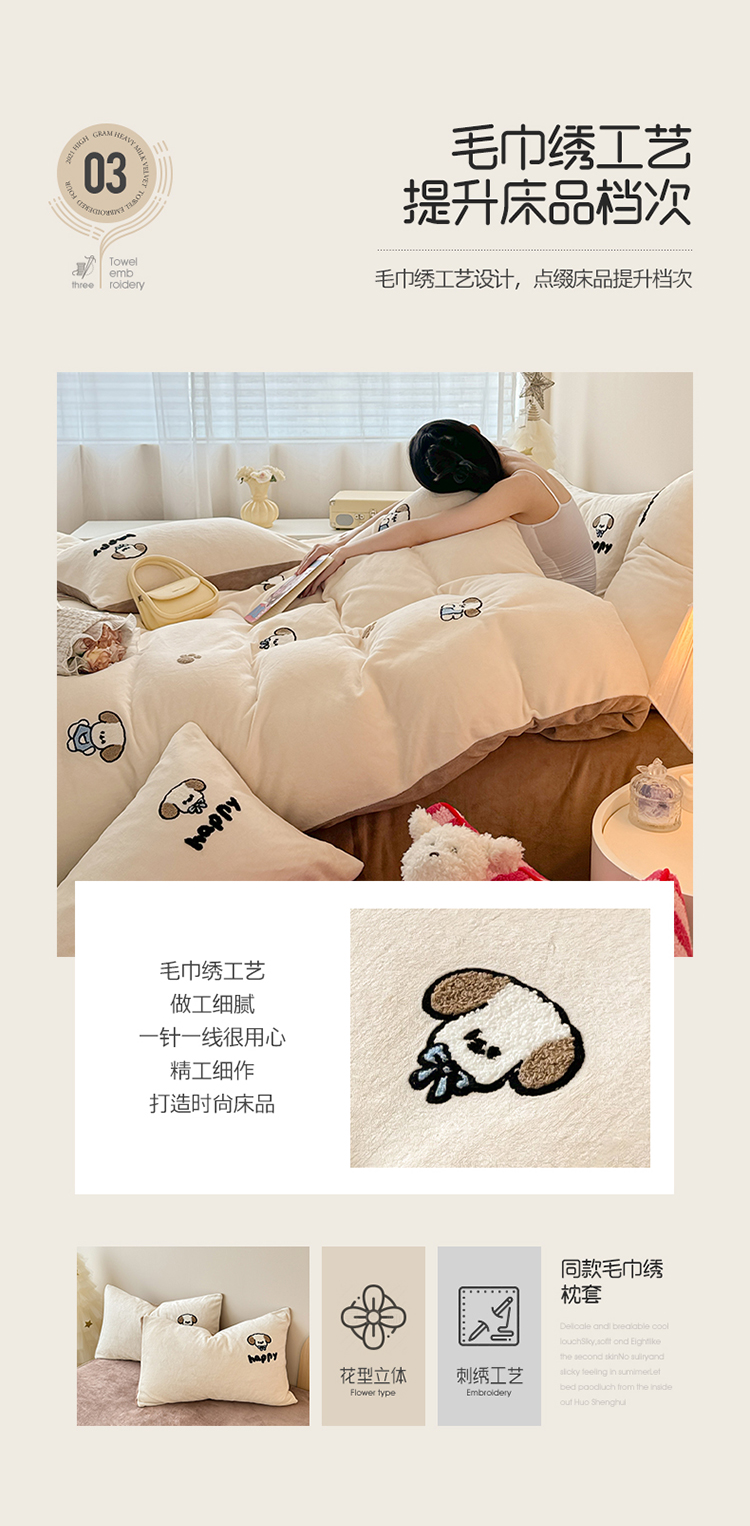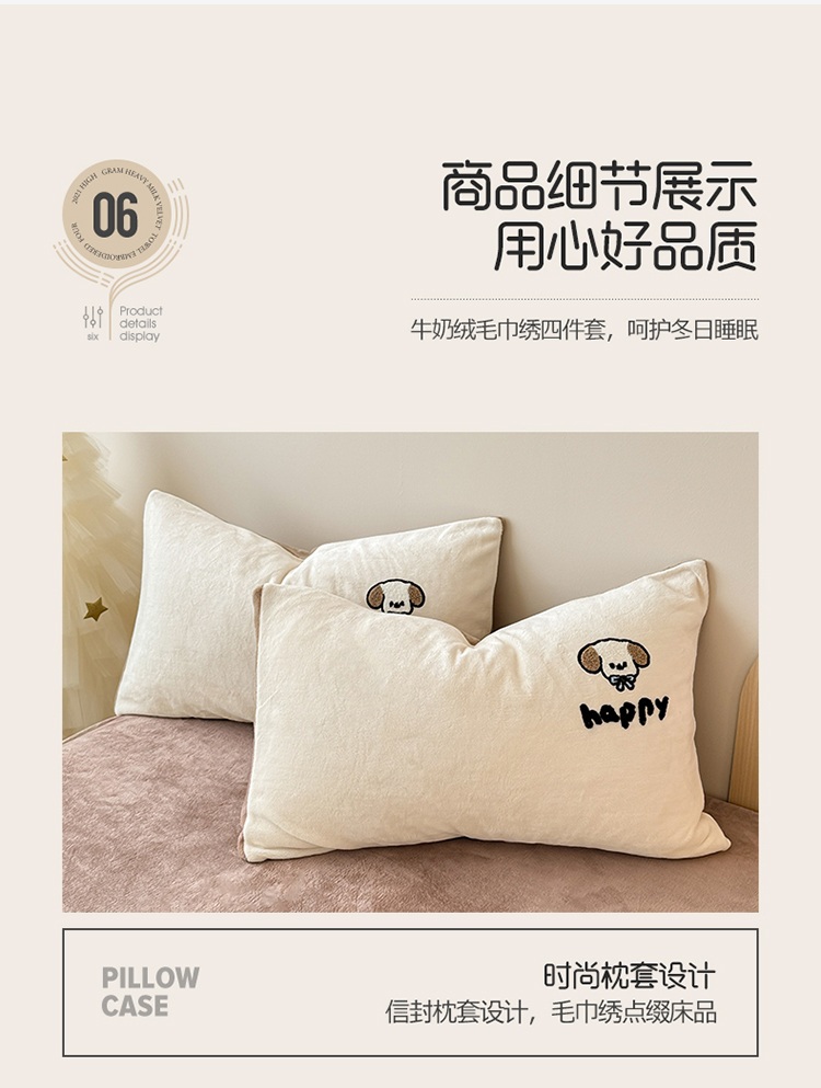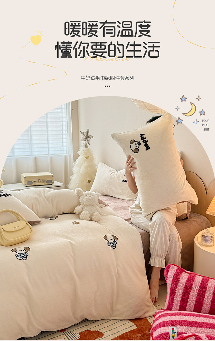 当前位置: 91家纺网 > 商品网购 > 床品套件 > 四件套 > 牛奶绒四件套 > 2024新款卡通牛奶绒专版毛巾绣四件套--萌小狗 萌小狗奶白奶咖