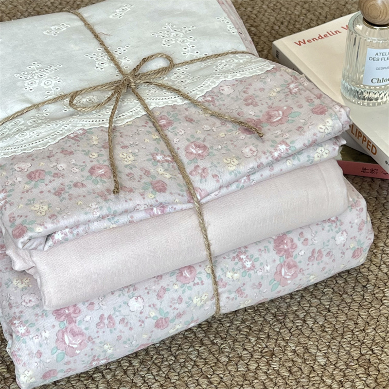 2024新款全棉印花双层纱四件套--蕾丝花边款 尽染-粉