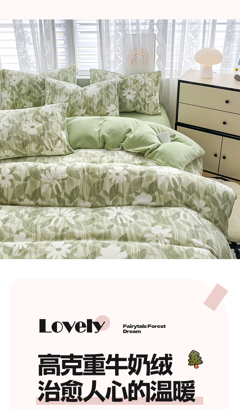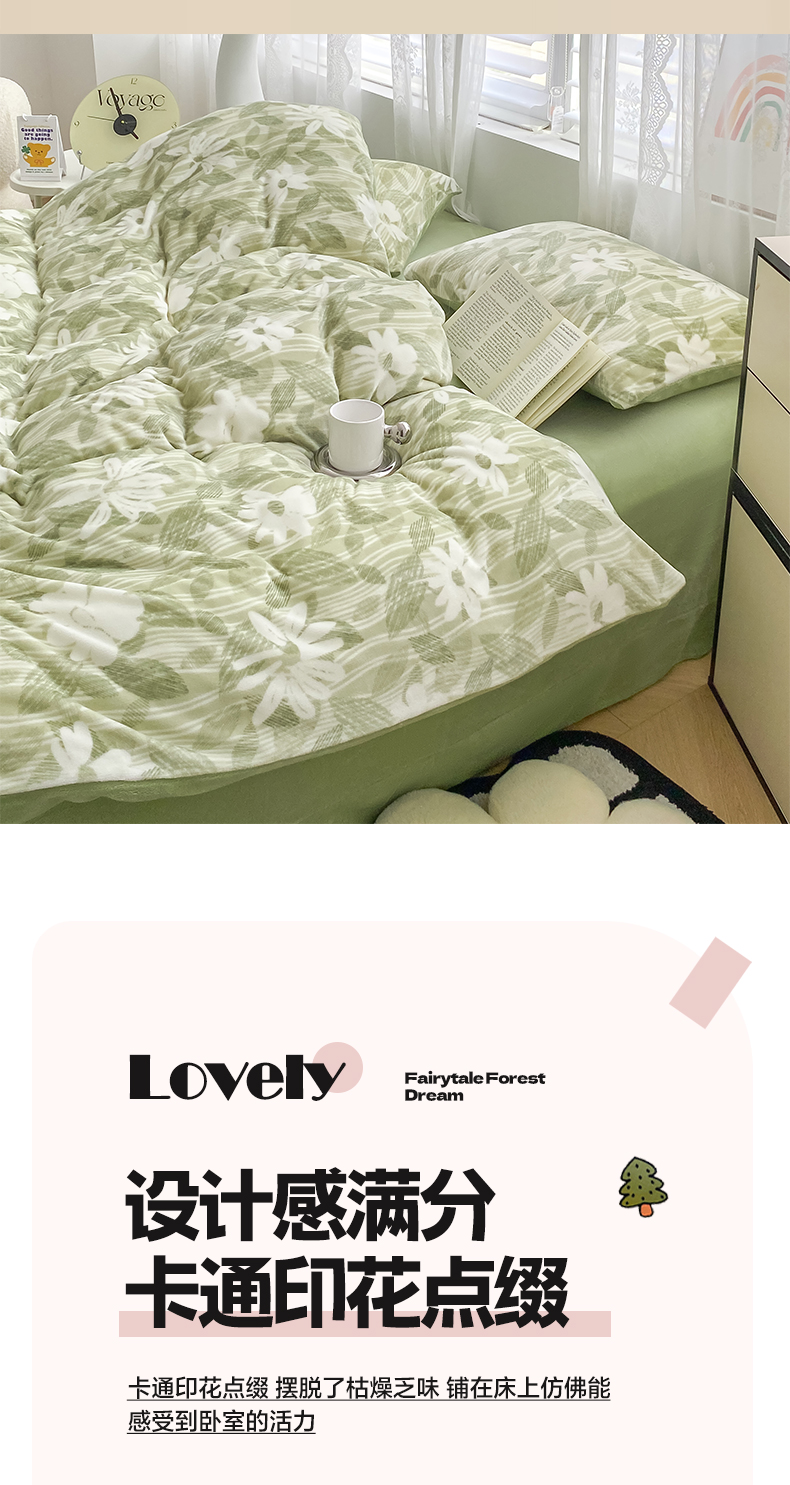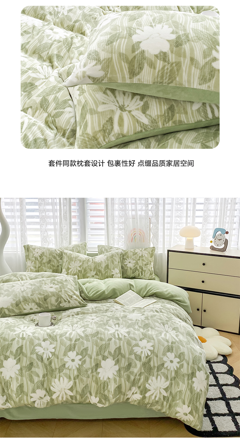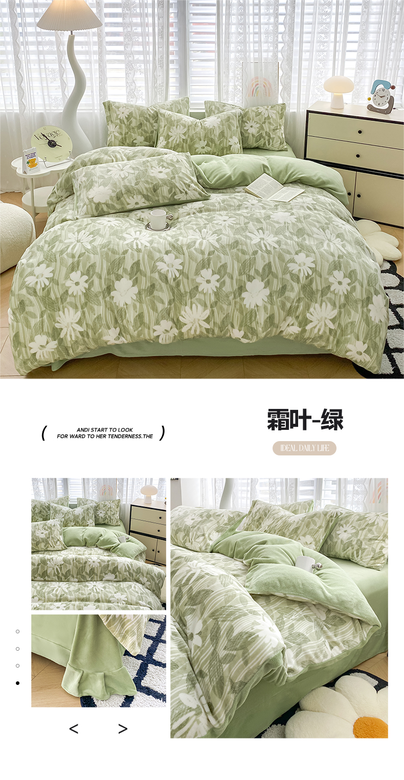 商品名称:帅露家纺 2024新款高克重牛奶绒印花四件套 霜叶-绿